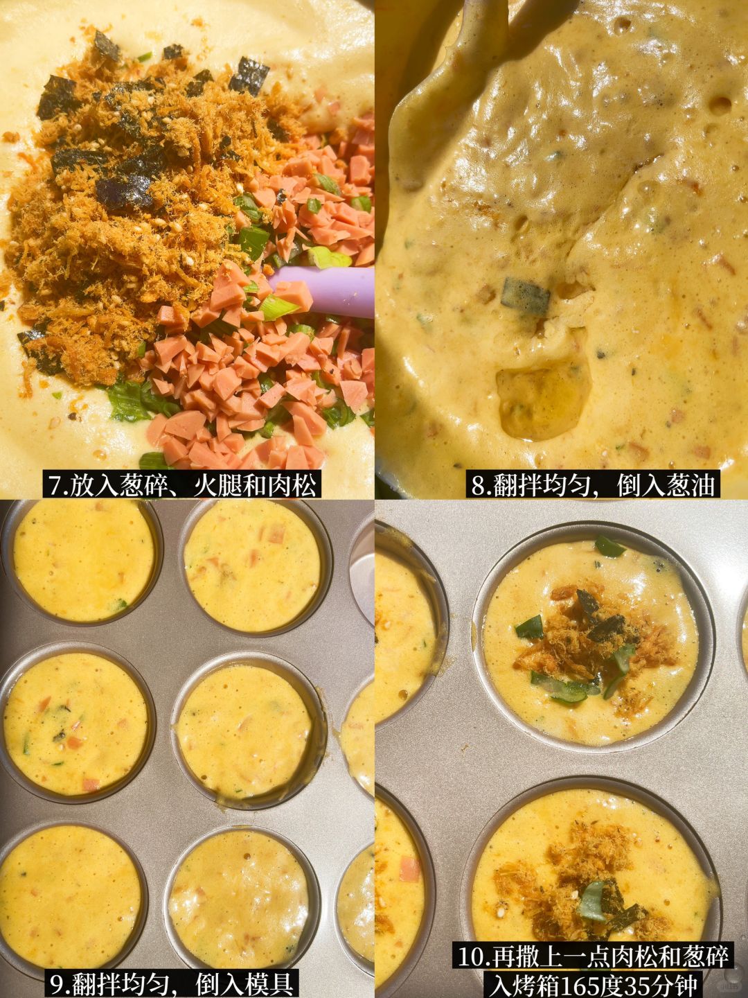 4️⃣倒入 步骤1️⃣熬制的葱油,继续翻拌均匀,倒入模具9分满,表面撒上葱花和海苔肉松