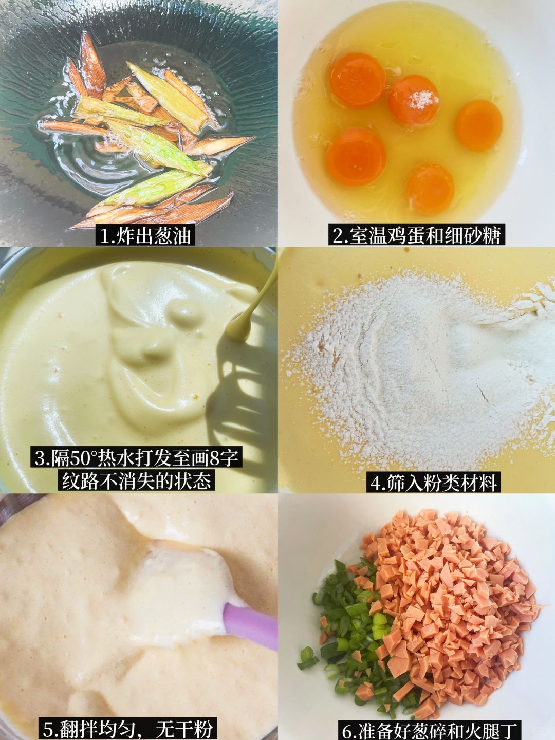 室温鸡蛋5个 低筋面粉125g 泡打粉4g 盐3g 细砂糖50g 玉米油30g 香葱、火腿、肉松适量