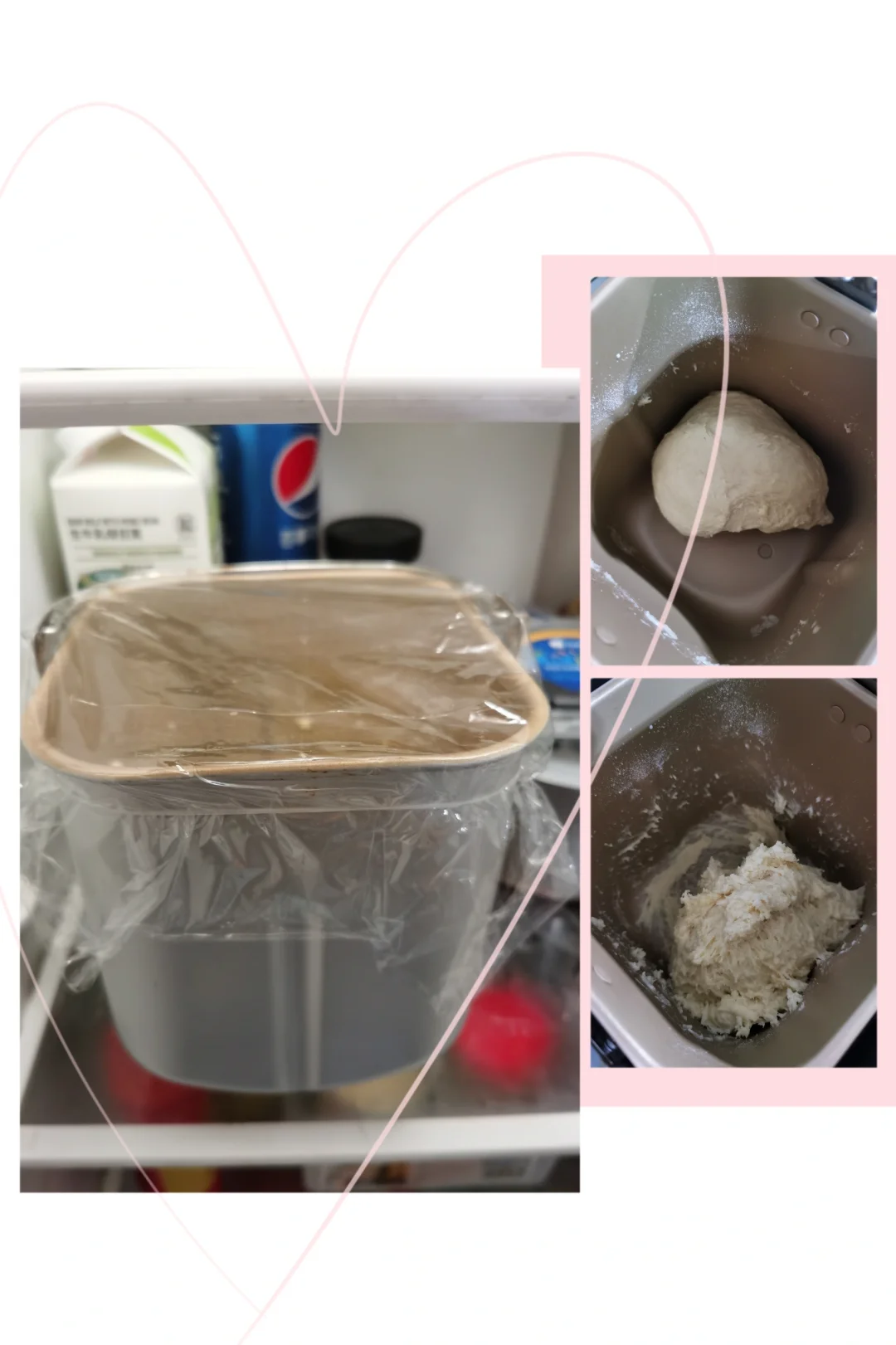 2. 面粉成团后,连面包桶一起放入冰箱,注意包好保鲜膜,防止面团变干。