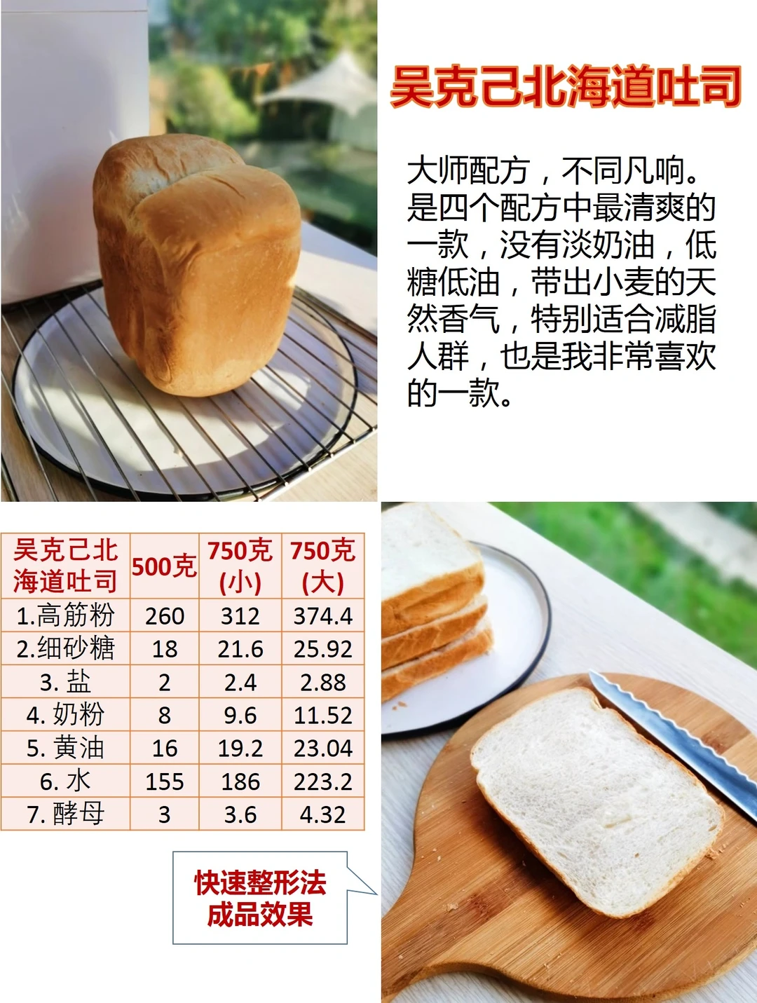 北海道吐司一直是烘焙界的宠儿,我用面包机做过很多口味的北海道吐司,这里选了4个被跟做最多的经典口味的北海道吐司,为方便不同面包机的主,照例列齐了各种大小面包机的配方。 这些都是既可以是用一键式面包菜单,也可以选择快速整形做法,操作步骤我都附在后面几张图上了。如果要看更详细的,可以查前面的单独笔记。 两种操作方式各有所长,“一键式”的比较方便,不用额外动手,面包比较蓬松;“快速整形法”时间短,面包组织更细腻,口感更好。两种方式的成品效果可以见图片对比,姐妹可以根据需要自己选择啦。