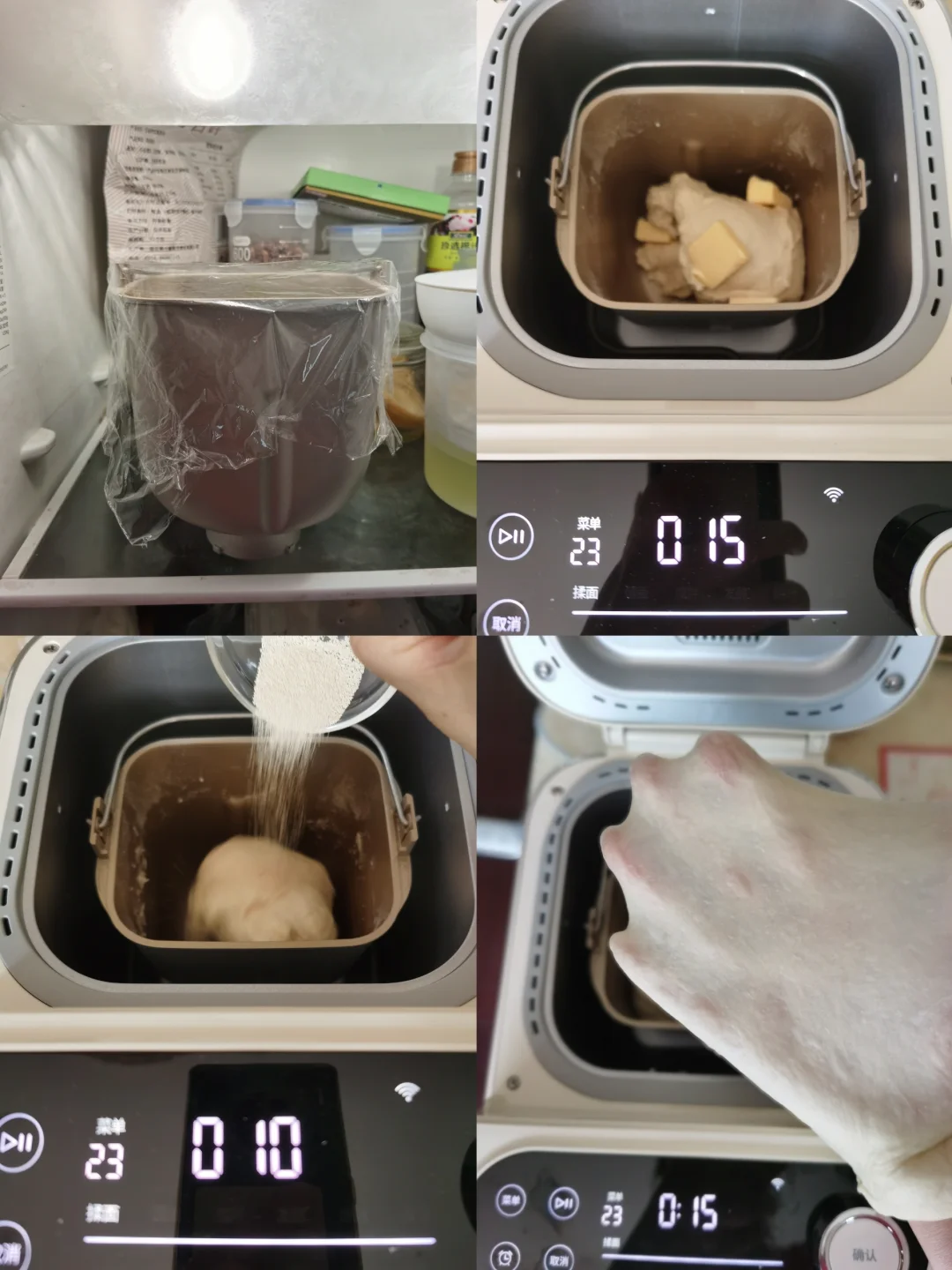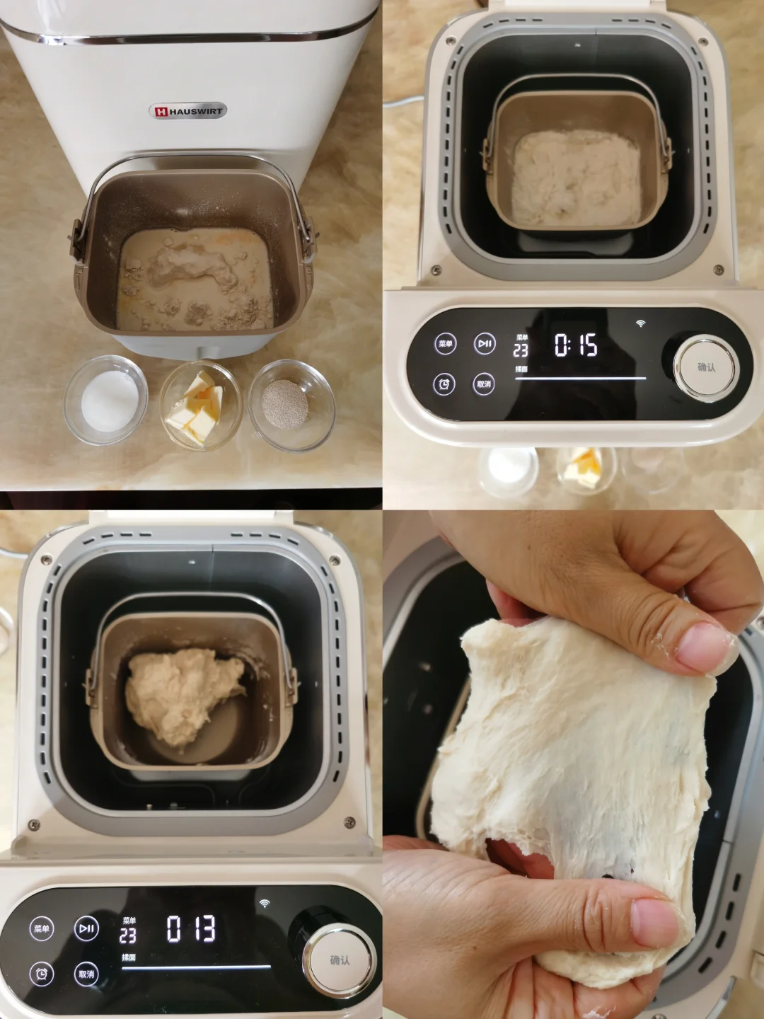 第二和第三种方法可以结合起来做,效果最好。我这里示范的是海氏面包机的操作,因为它有单独的揉面、发酵和烘烤功能,能够很方便的根据环境温度调整操作。其他很多面包机都有相同功能,一样做。