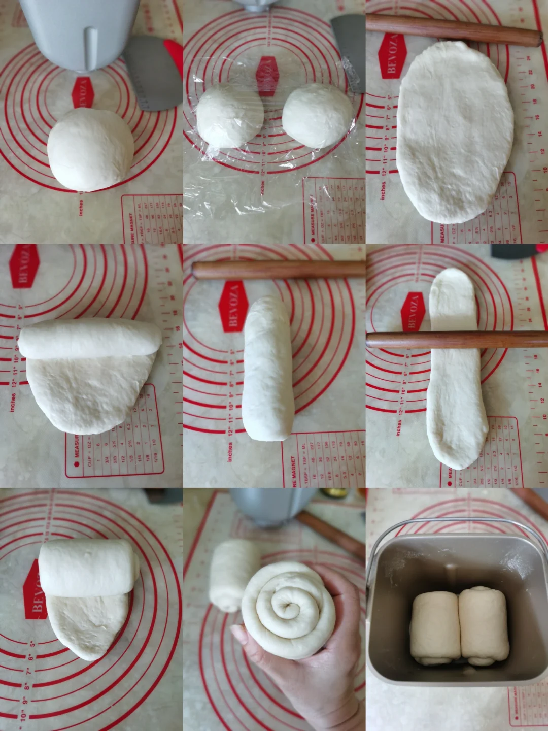 6. 拿出面团,取走搅拌棒, 按图7方式整形。平均分两块,分别擀两次卷,放入面包桶。