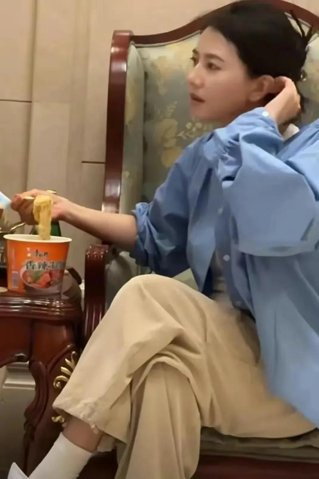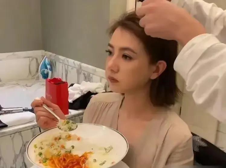 高圆圆真的好敬业,一边化妆吹头发一边大口吃蛋炒饭,看样子就是很饿了! 明星拍戏,