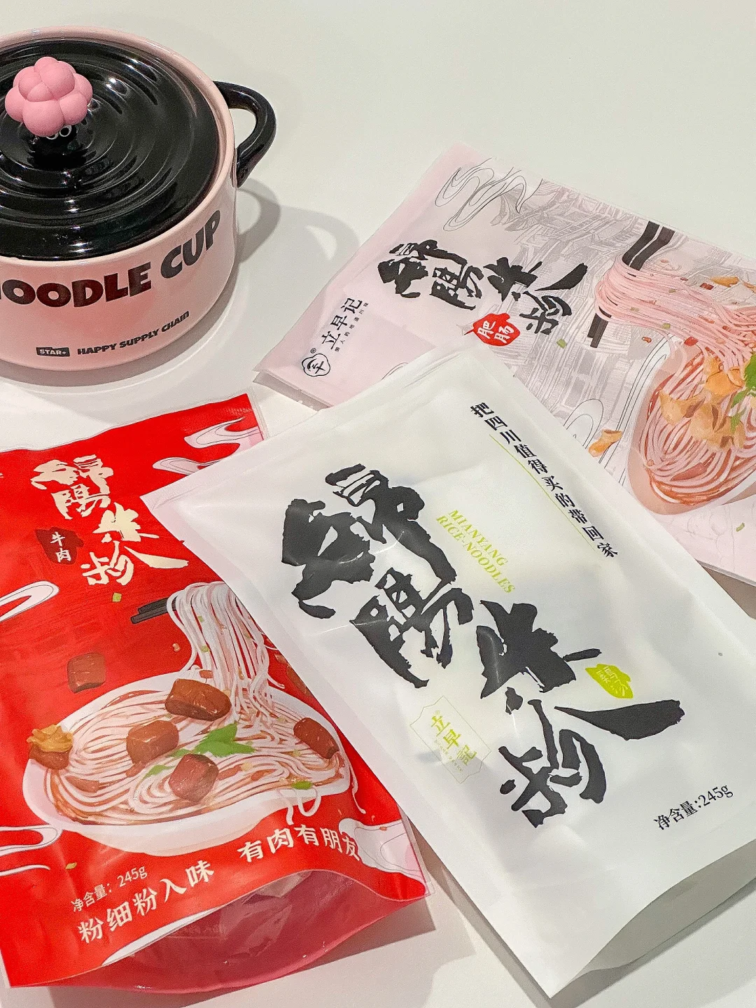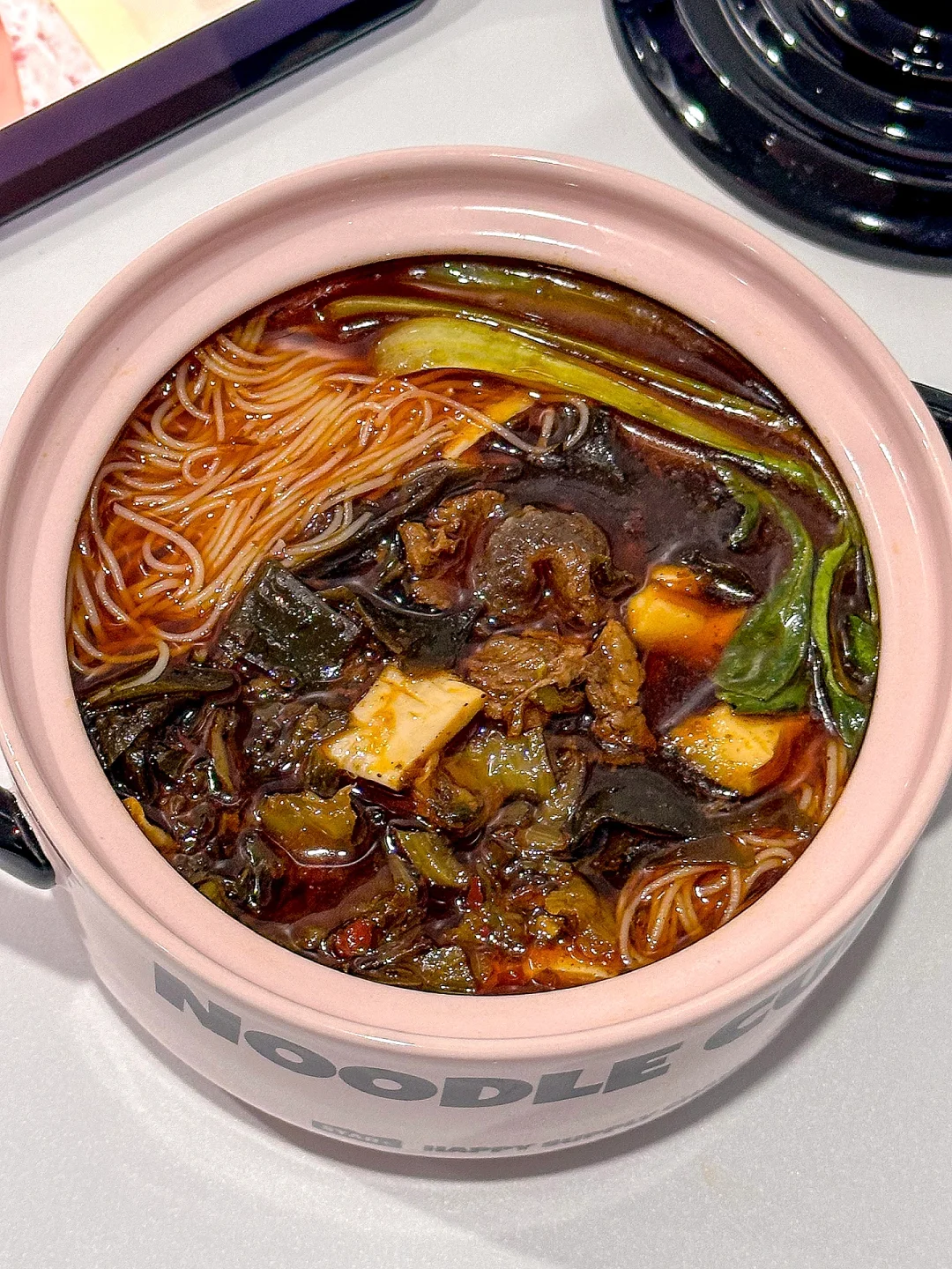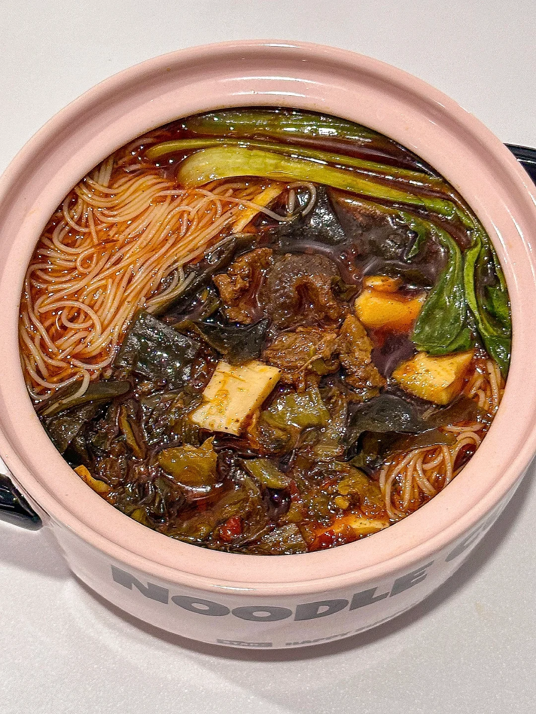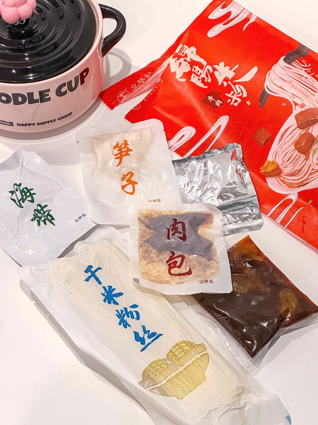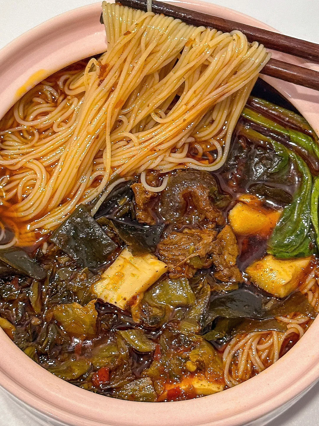面食主义一定要试试绵阳米粉啊!! 细细软软的米粉不要太爱了555 汤麻麻辣辣的!吸满汤汁那叫一个绝啊! 牛肉味的牛肉超大块!还有海带、酸菜和笋 荤素搭配!煮几分钟就ok了! 吸满汤汁的粉丝可别太好嗦了!! 贼香贼入味!好吃又方便!! 搭配的这个碗黑粉的颜值可高了!! 用上这个碗吃啥都香~