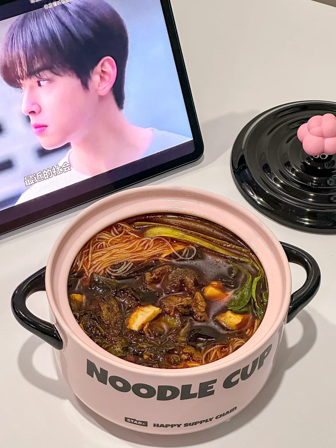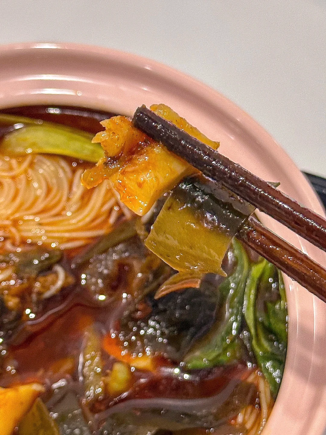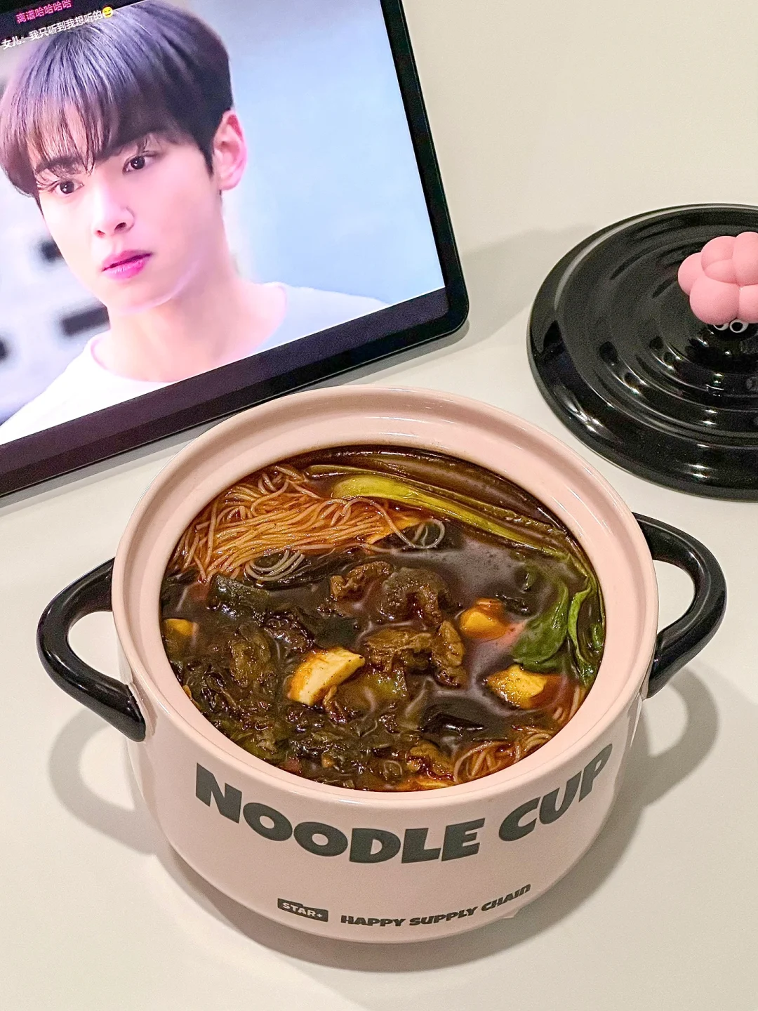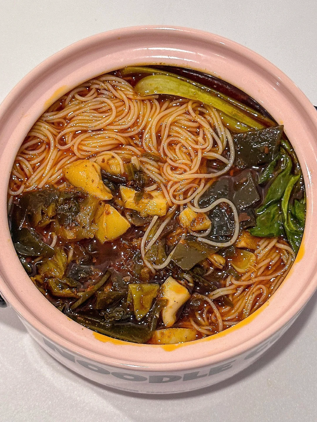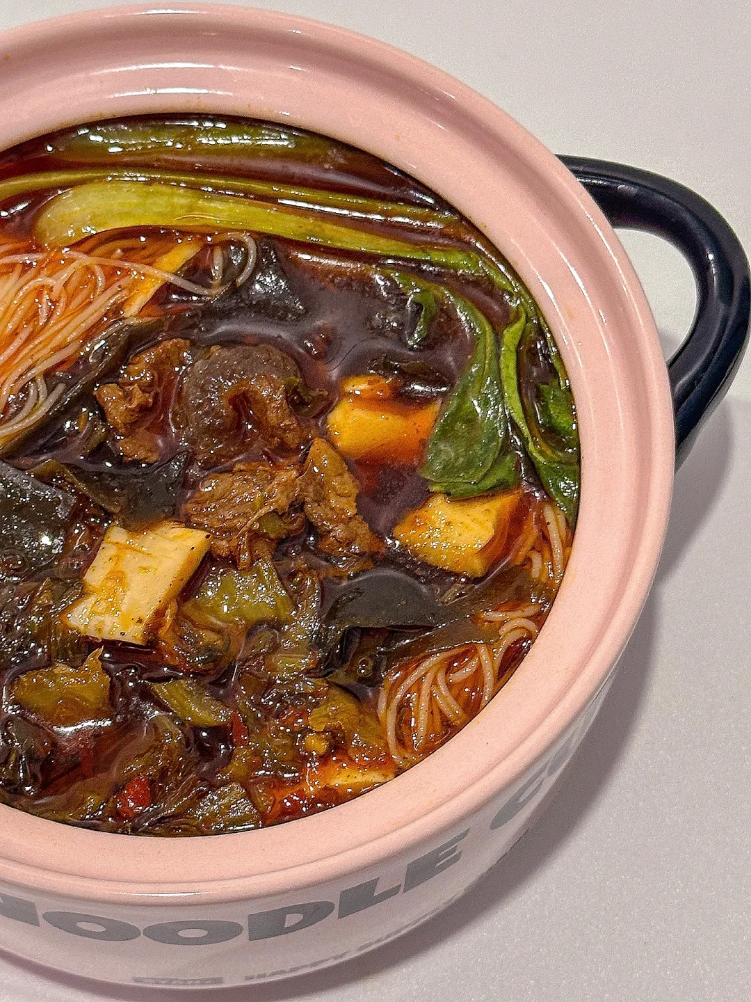 面食主义一定要试试绵阳米粉啊!! 细细软软的米粉不要太爱了555 汤麻麻辣辣的!吸满汤汁那叫一个绝啊! 牛肉味的牛肉超大块!还有海带、酸菜和笋 荤素搭配!煮几分钟就ok了! 吸满汤汁的粉丝可别太好嗦了!! 贼香贼入味!好吃又方便!! 搭配的这个碗黑粉的颜值可高了!! 用上这个碗吃啥都香~