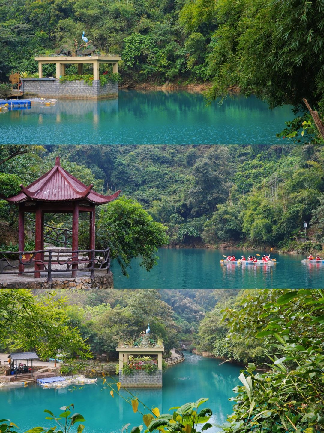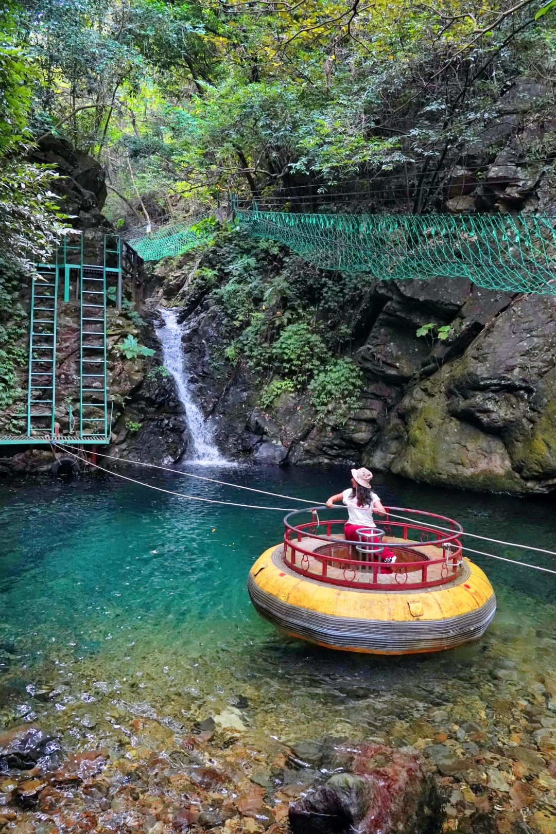 ✓ 山溪浮艇:拉着绳子带动浮艇划动,打破了玻璃般透明的山溪池塘