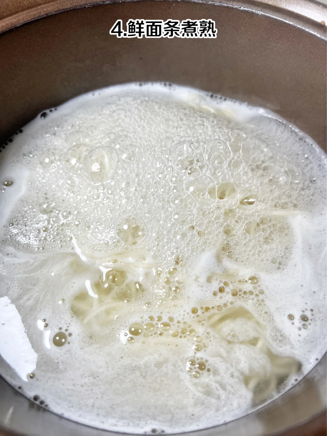 4️⃣ 鲜面条煮熟,记得要煮至面条Q弹有嚼劲哦!🍜