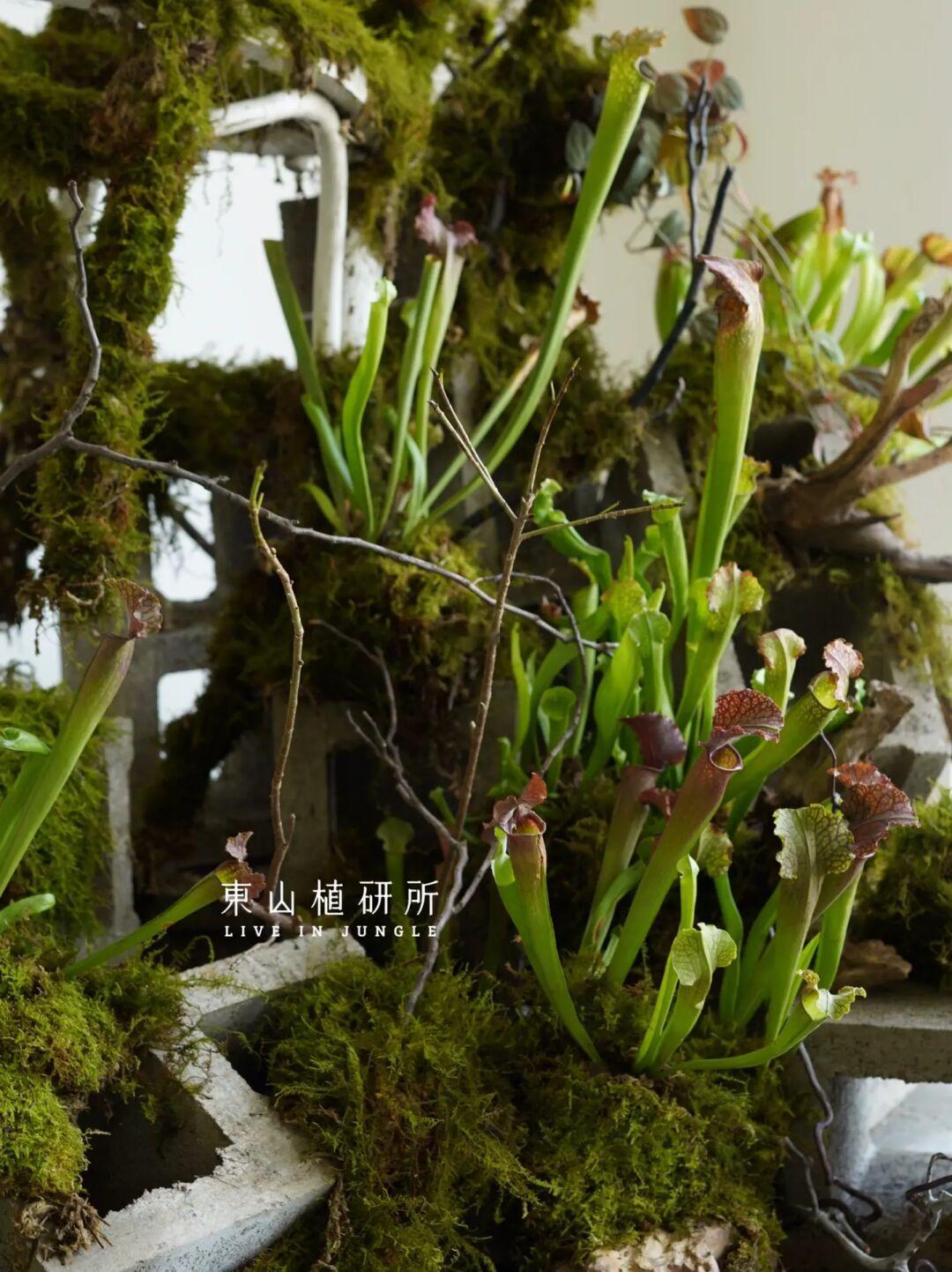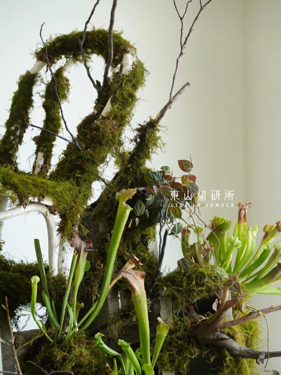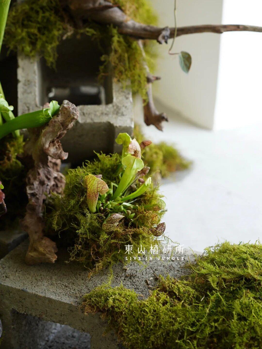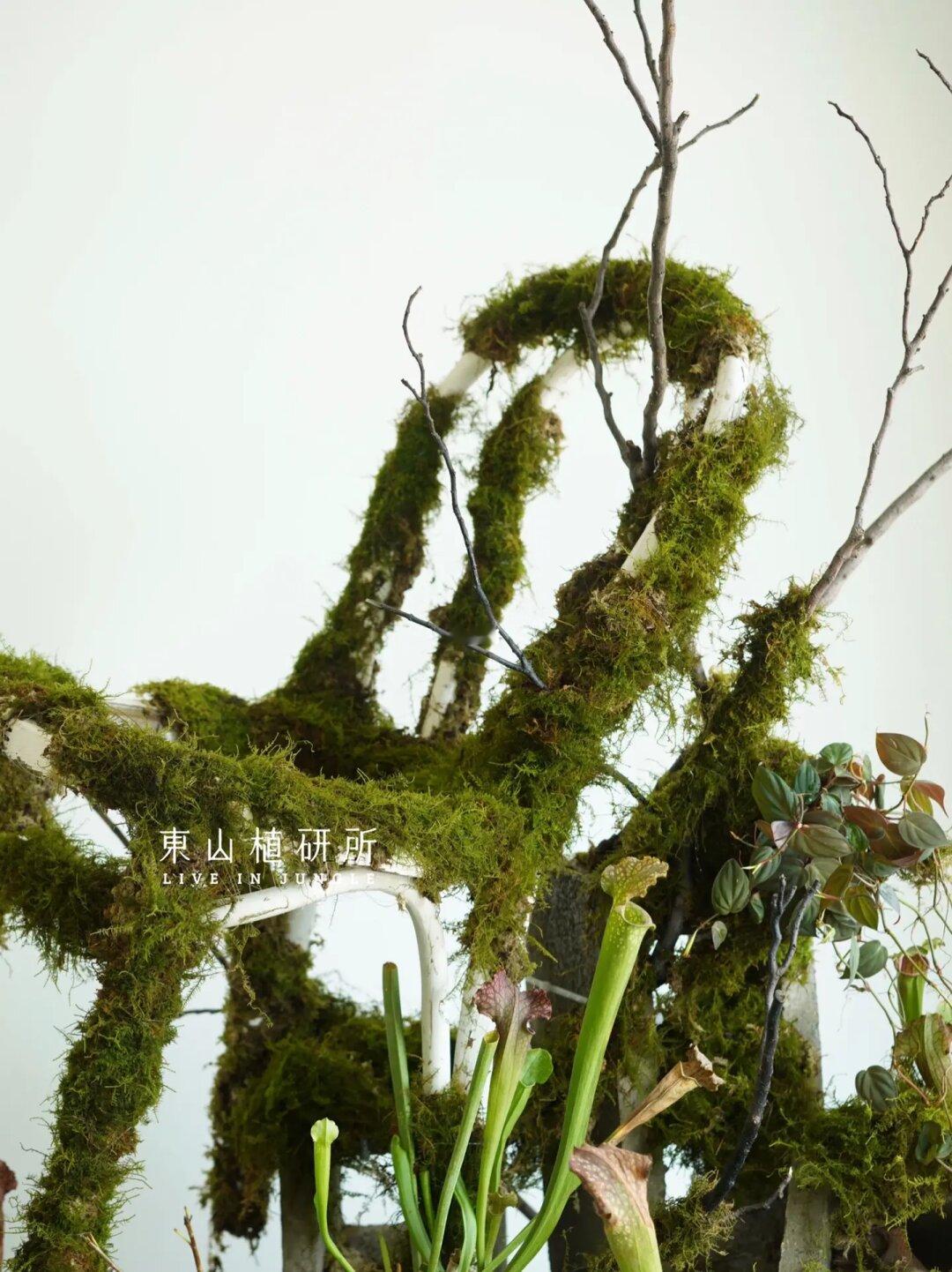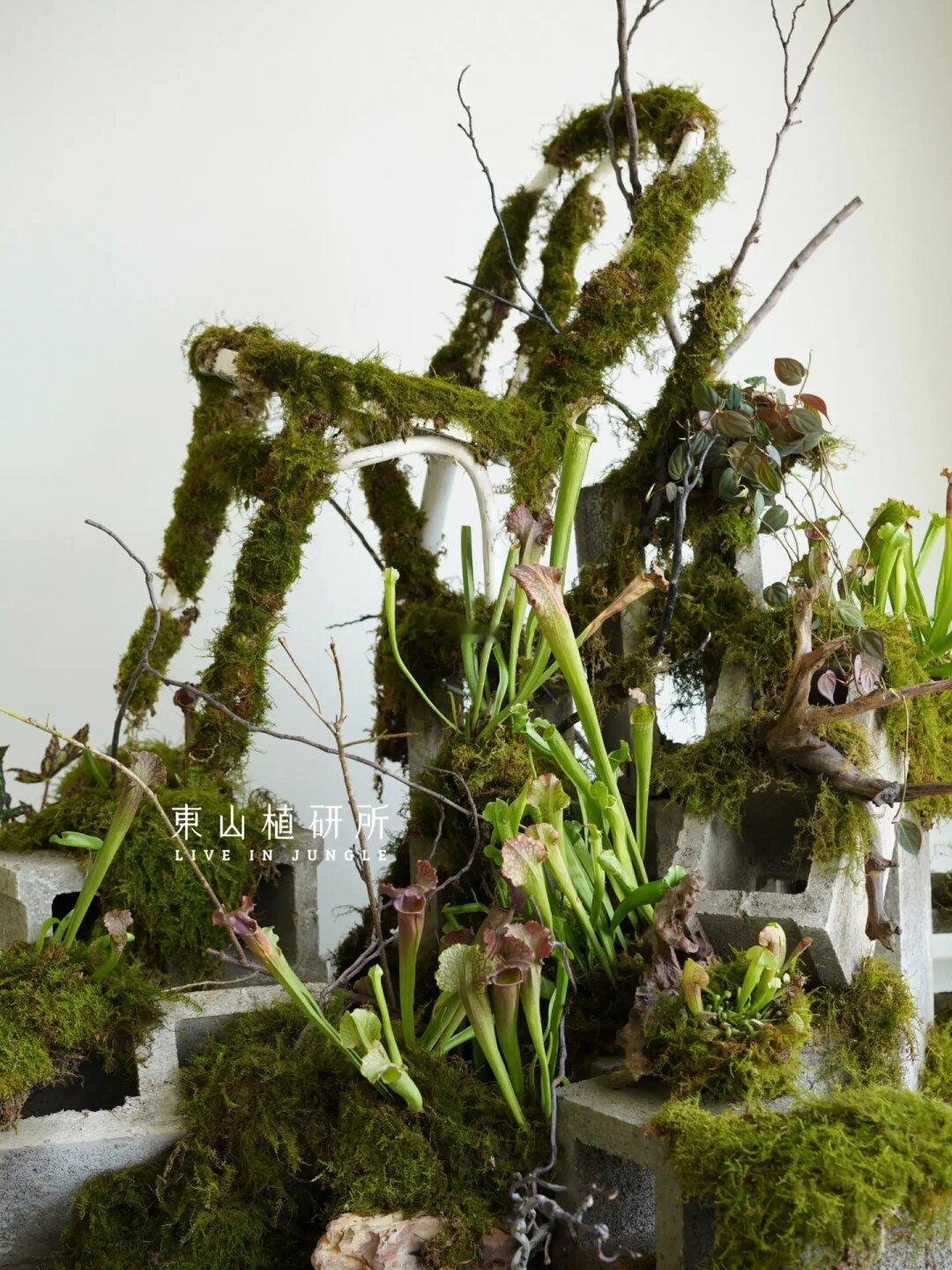自然艺术与创意家具碰撞,诞生了这个绿植装置。 椅子倾斜在空心砖上,仿佛悬浮在空中;树枝缠绕椅子努力向上,像是有生命的伸展。苔藓覆盖在椅子和空心砖上,正是这层厚厚的绿色,使整个装置充满生机。 形状独特的瓶子草仿佛是深海的绿色珊瑚,让人眼前一亮。 植物与家具的结合,呈现出一种自然之美与现代设计的融合。 植物不仅是装饰,它还给设计带来独特的生命力。 ——————