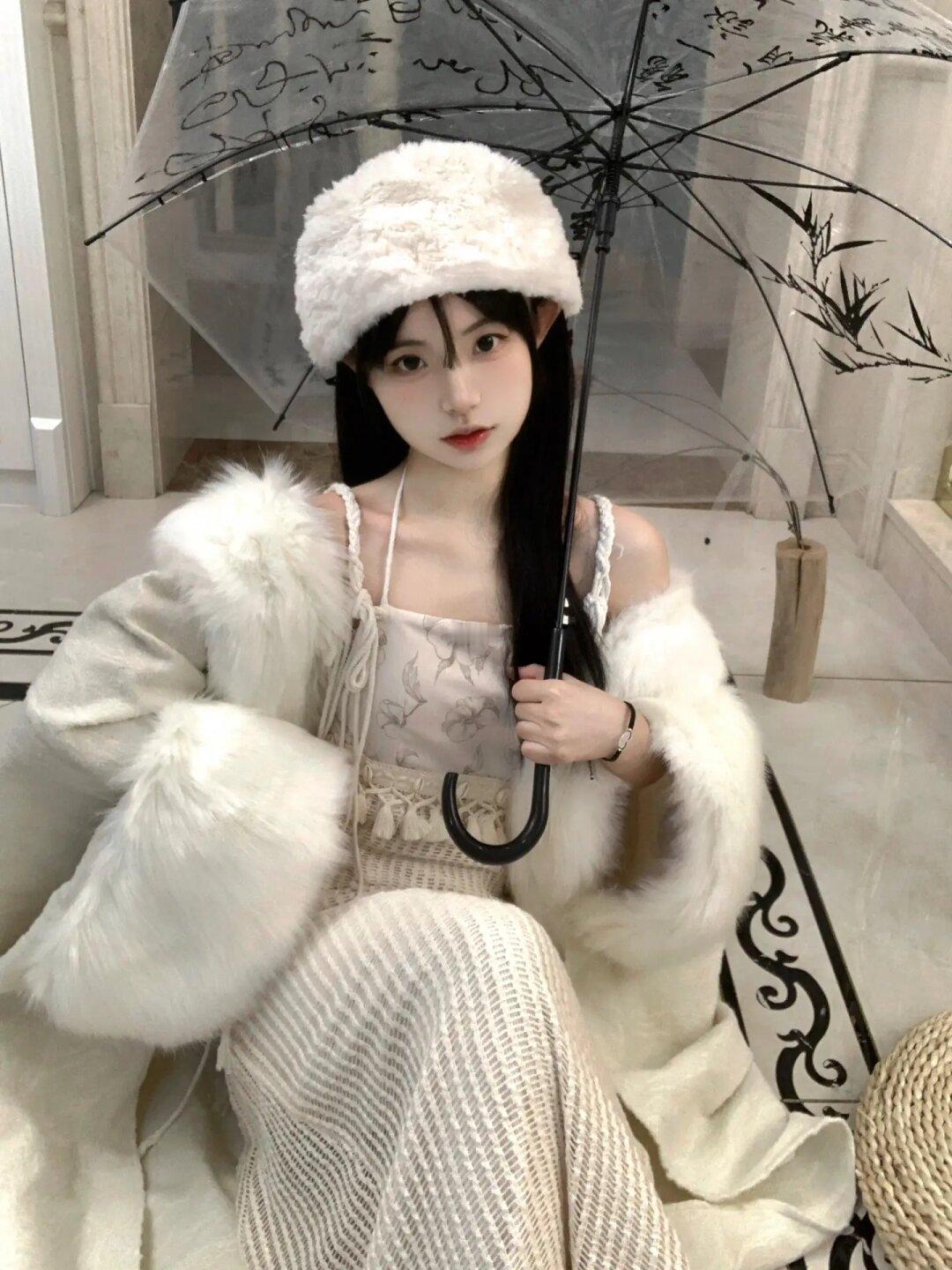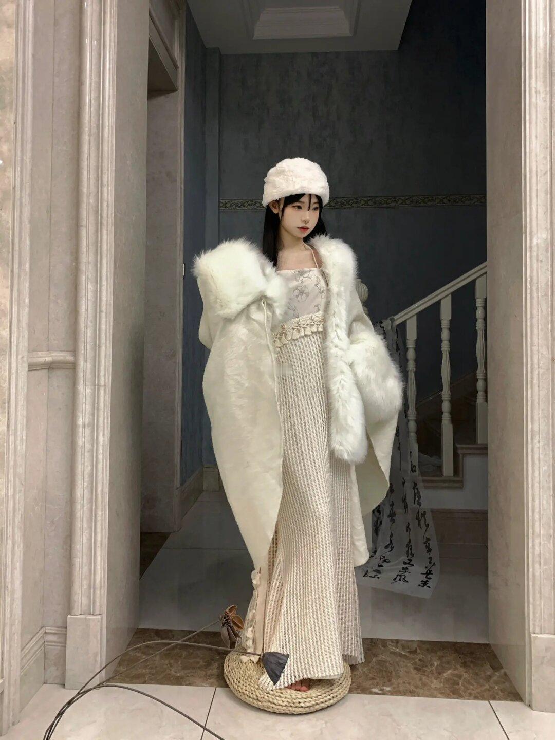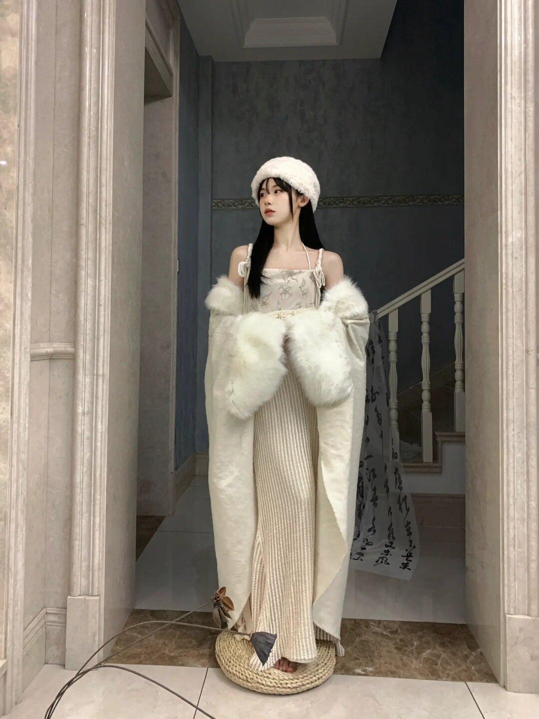 把冬天穿在身上啦❄️ 翻毛皮斗篷大衣➕做旧流苏风吊带裙 编织腰带上还用贝壳🐚做了装饰 满满复古清冷感~