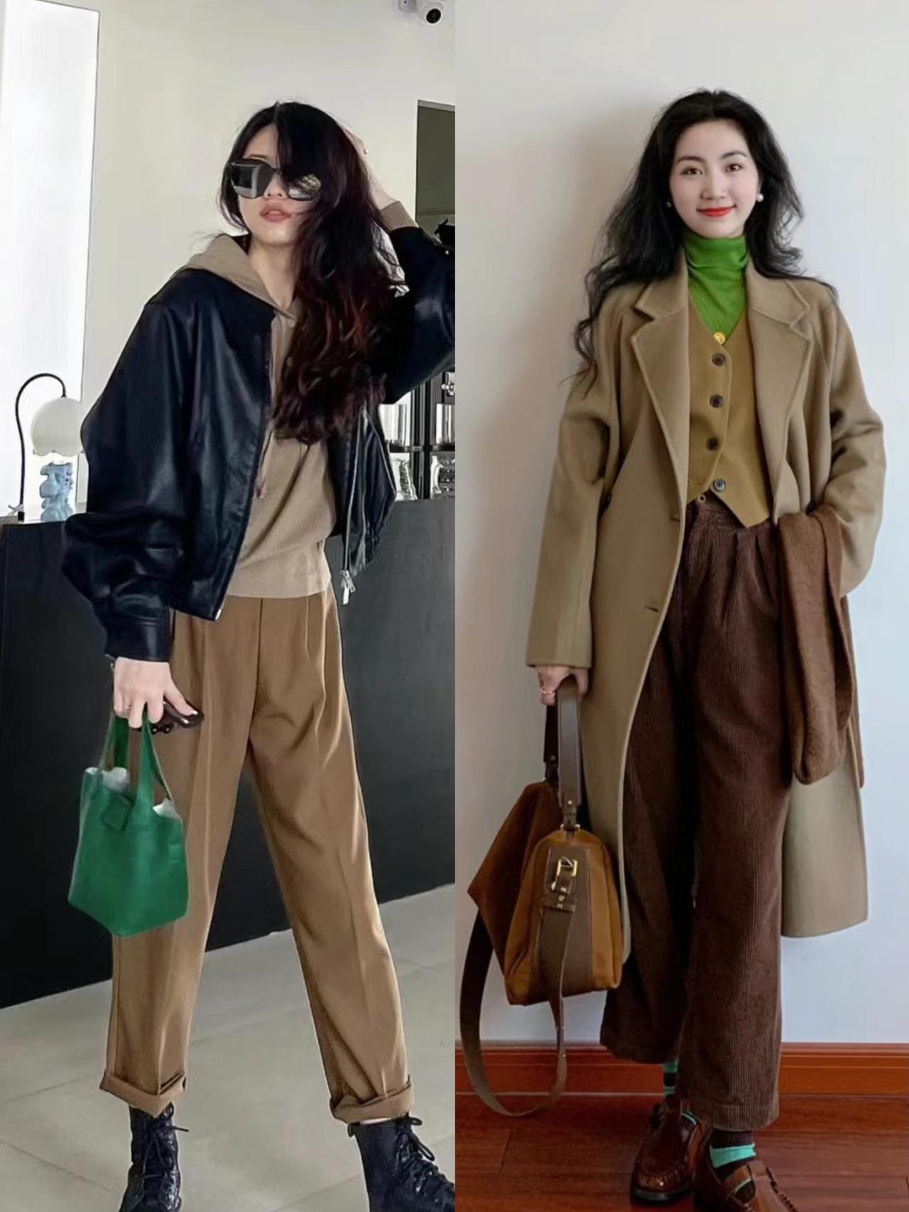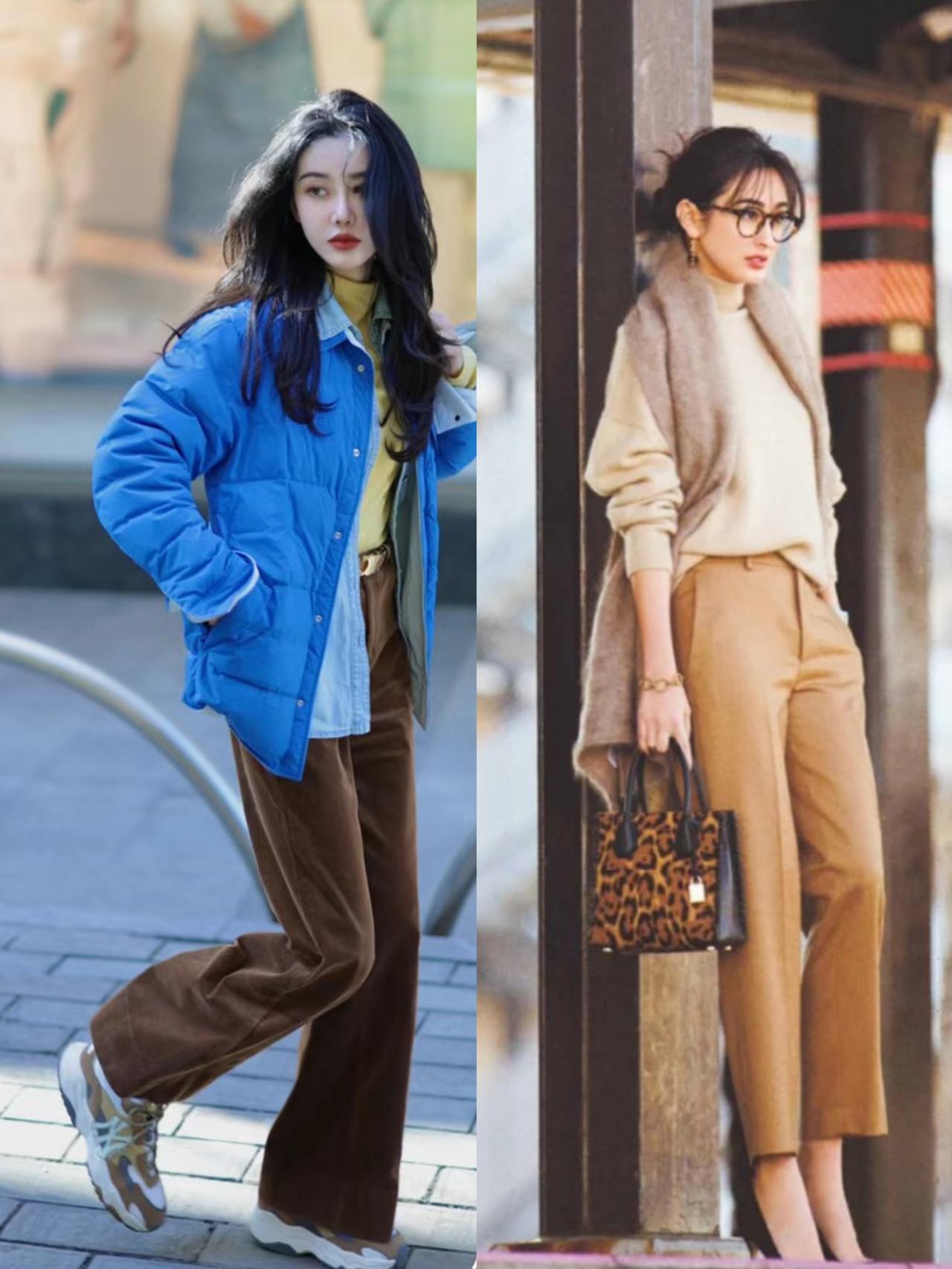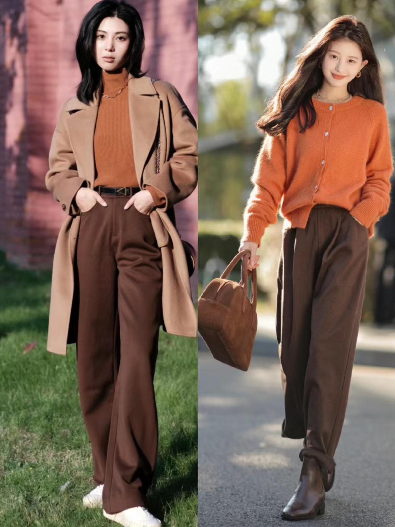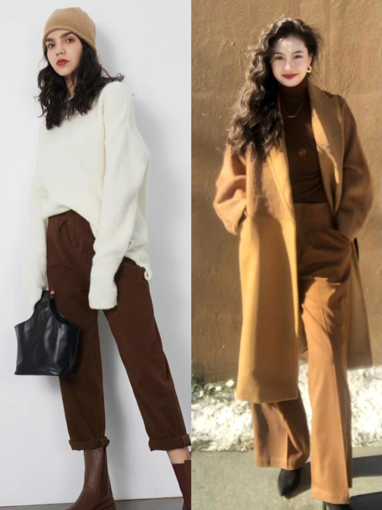 冬天里的氛围感,都是“咖色裤子”给的,这样搭显白又提气质 冬天里的咖色裤子,不仅有温暖感,还能增加气质。可以搭配西装外套、针织衫、夹克外套、双面呢大衣、条绒裤和毛呢裤等款式,选择高腰裤、直筒裤、锥形裤等适合自己的款式。搭配技巧是,内搭修身保暖,外搭利落显气质。