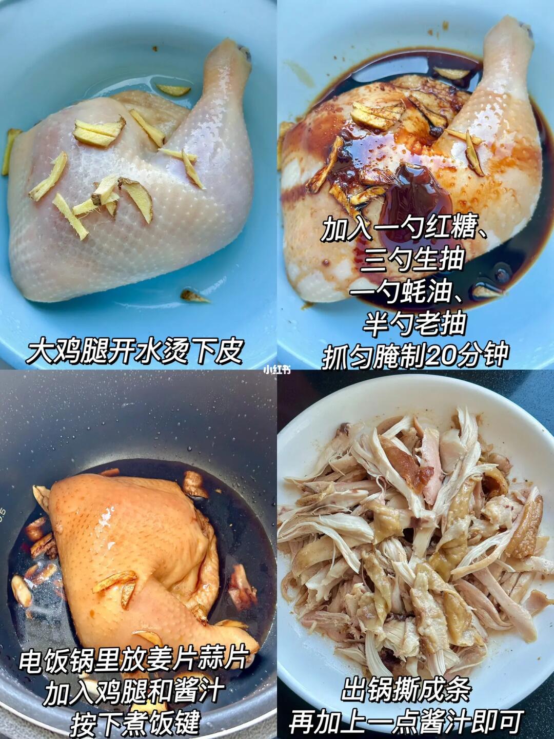 懒人都给我去学这个酱油手撕鸡!!尊嘟好好吃!而且炒鸡方便!丢丢电饭煲里煮熟就好了!而且还很嫩~[飞吻R][飞吻R] [打卡R]准备食材 一个大鸡腿 姜蒜 [打卡R]做法如图