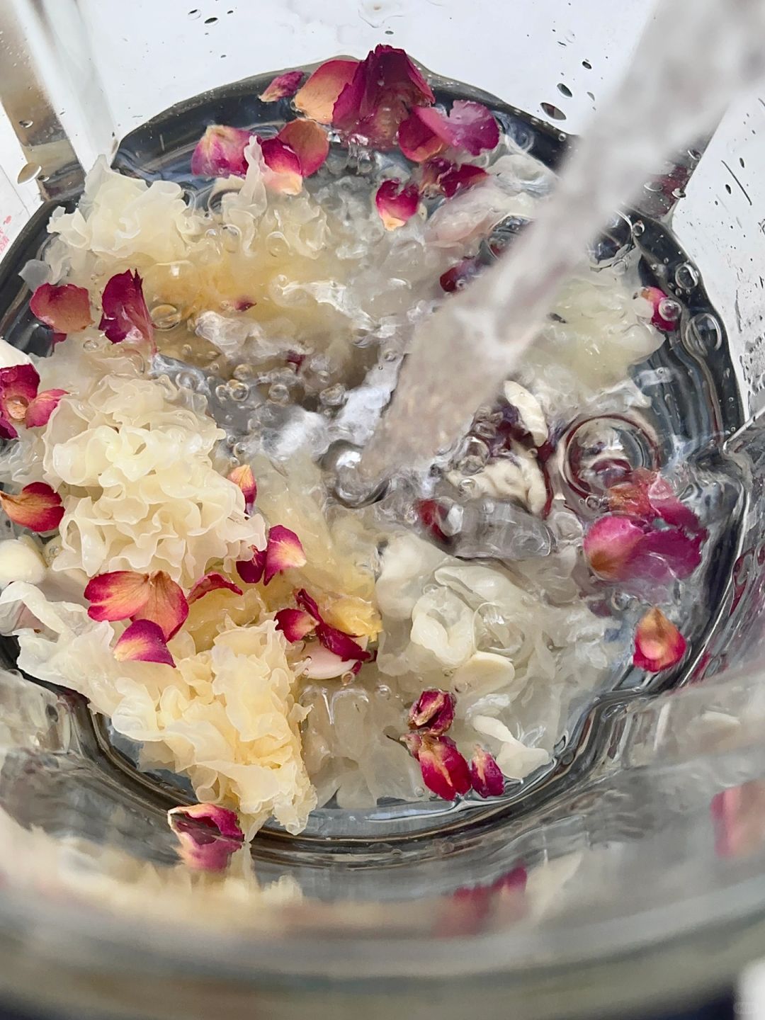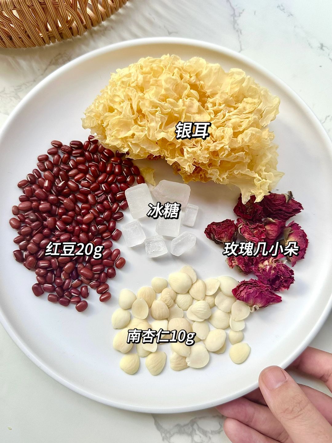 ✅食材:南杏仁10个、玫瑰几小朵、银耳、红豆20g、适量冰糖