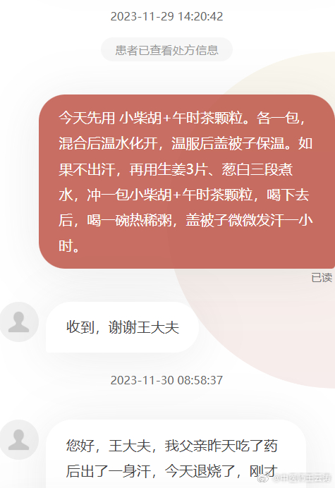 患者,男性,61岁,发热。用 午时茶颗粒+小柴胡颗粒+覆被取汗 治疗,效果非常好。