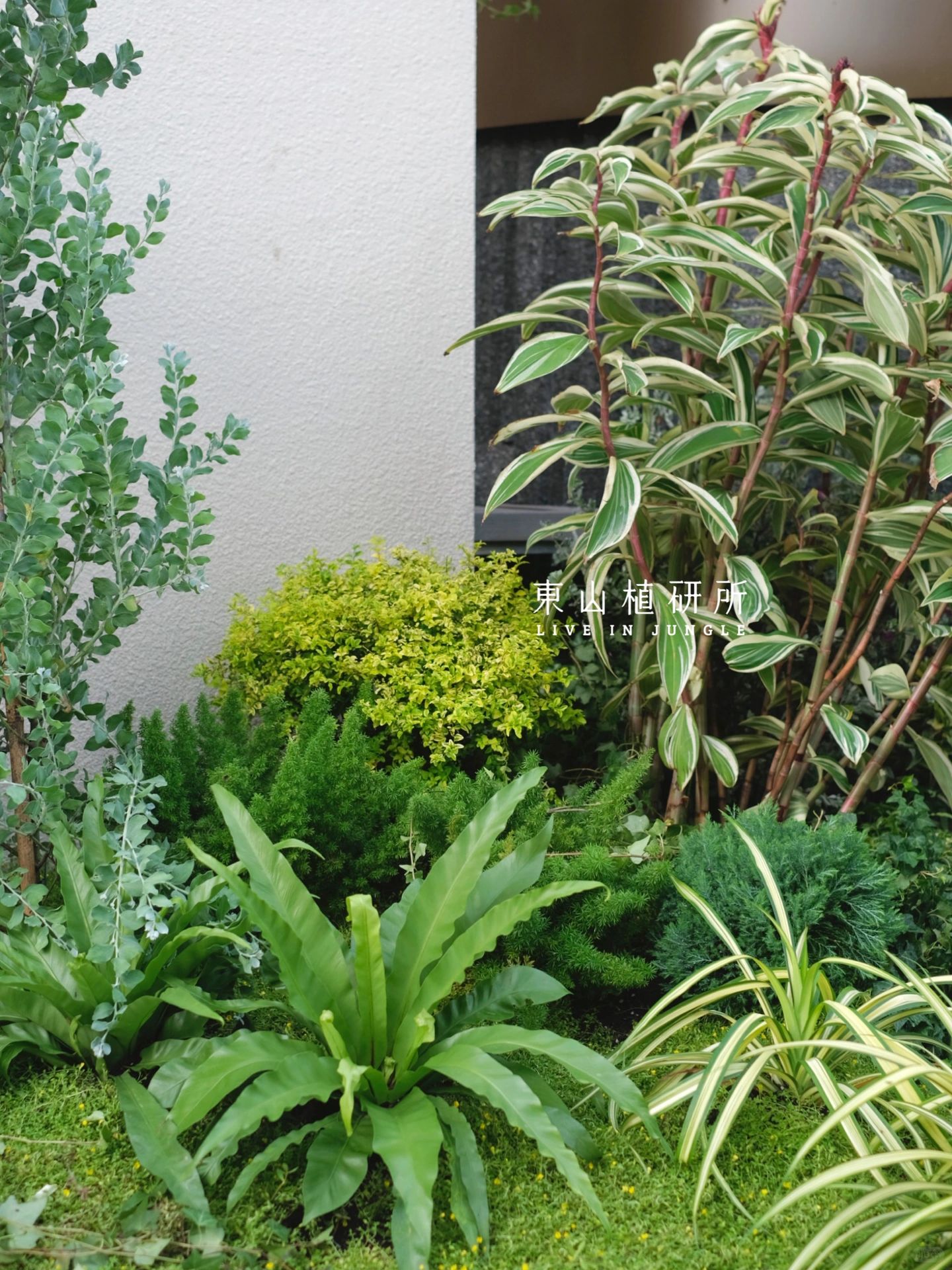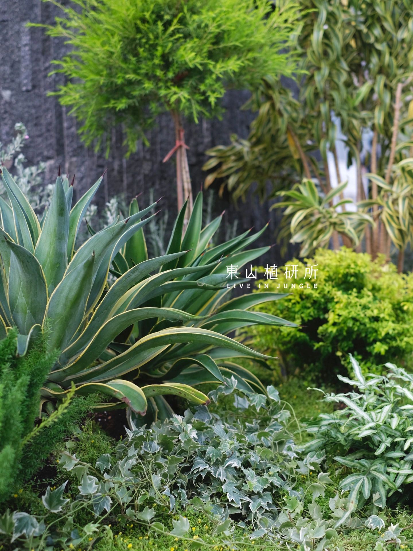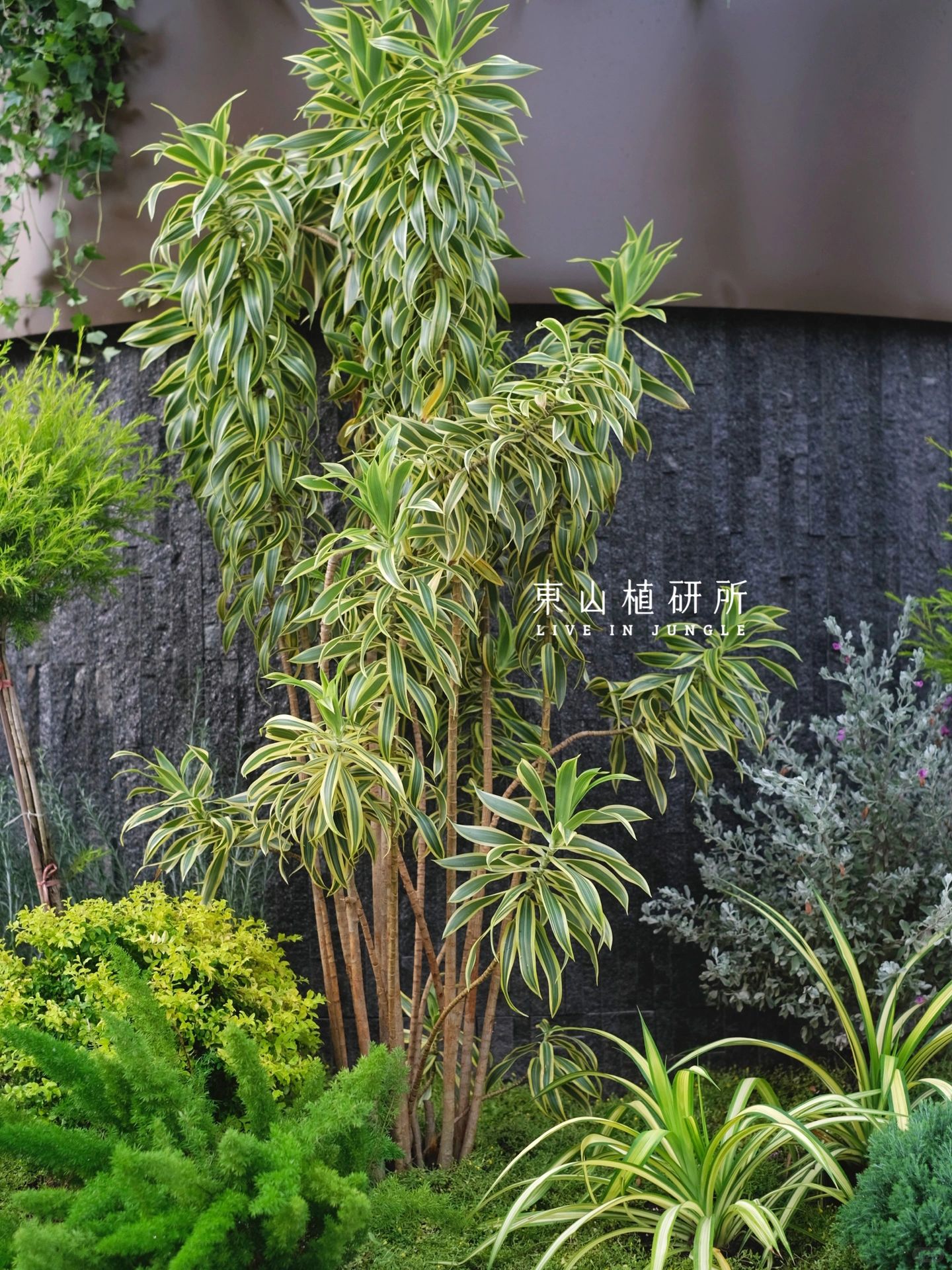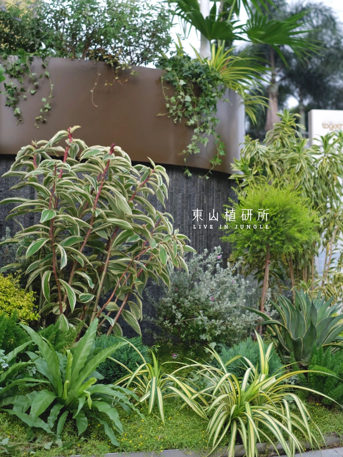 花叶植物 黄绿色设计元素 金边百合竹 花叶闭鞘姜 金边龙舌兰…… 独特的叶片纹理、清新的黄绿色调 凸显视觉亮点 高低起伏丰富层次感 草类植物自然散落、蔓延,弱化边界 植物清单:常春藤/天门冬/银叶金合欢/鸟巢蕨/高山榕/龟背/金边百合竹/散尾葵/千层金/龙柏/花叶闭鞘姜/吊兰 ——————