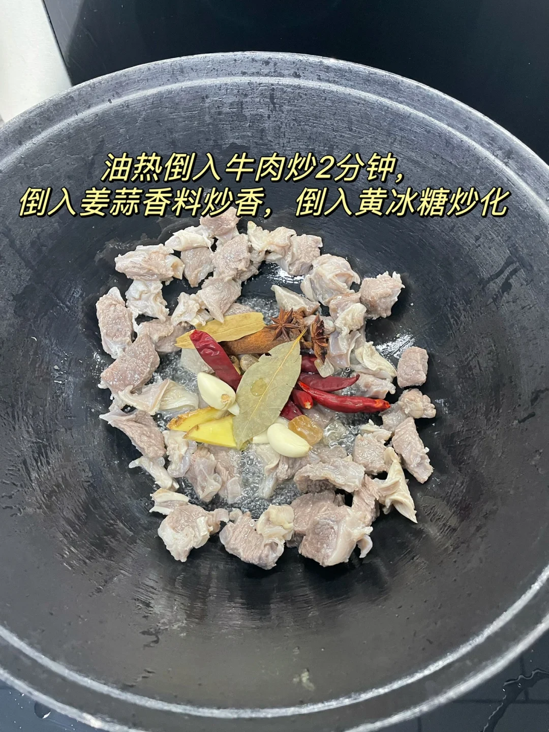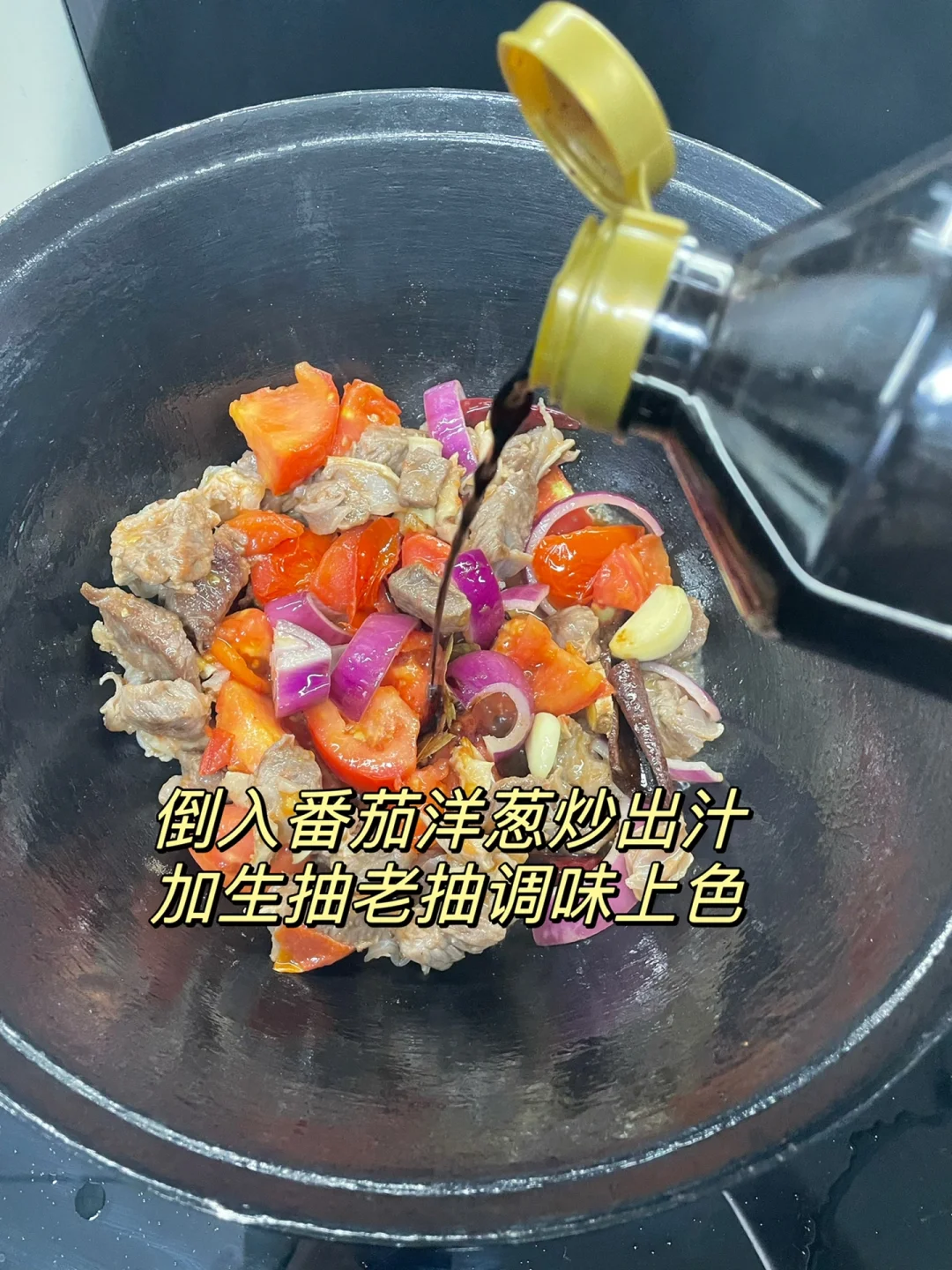 2⃣️:锅中加入适量油,倒入牛腩炒2分钟,再放入姜蒜香料炒香,倒入冰糖炒化,倒入二分之一洋葱炒软,番茄炒出汁,再加入生抽老抽调味上色
