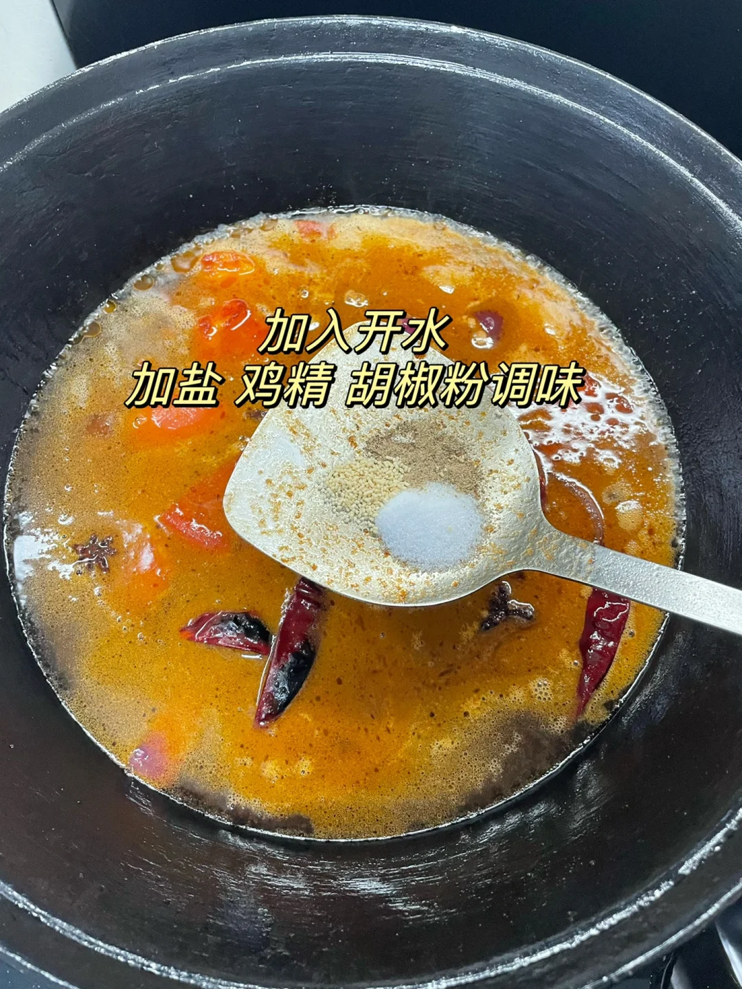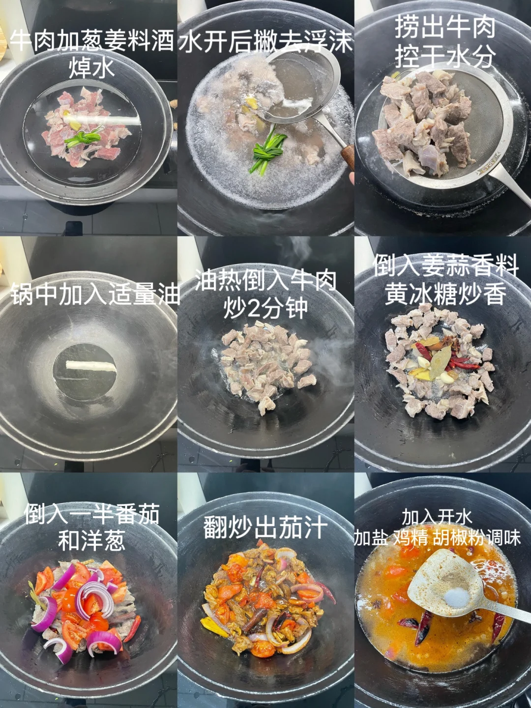 3⃣️:加入开水,再加适量盐 鸡精 胡椒粉,盖上盖子转中小火焖煮一个小时,再倒入土豆和剩下的番茄继续焖煮半小时,待土豆和牛肉软烂,汤汁收至适量,关火撒点葱花即可