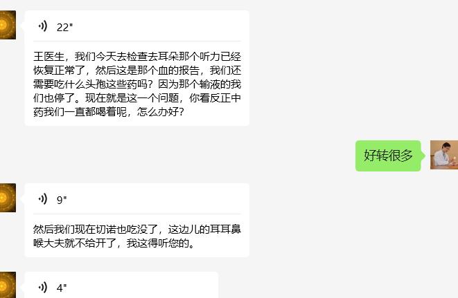 今日患者去医院复查,听力恢复,体温正常。