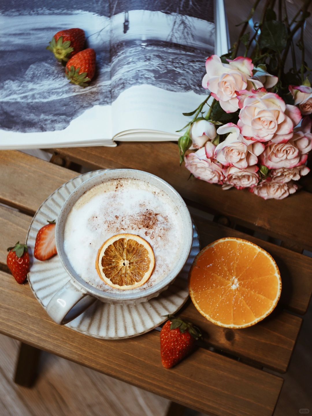 自带滤镜 这两天气温骤降抛开了冰美式,只想来一杯热气腾腾的拿铁驱散寒意❄️ 自己制作的橙子糖浆,增添了拿铁的风味 · ▪️【制作步骤:】 ①橙子洗净,表面戳上洞洞,锅内加水和橙子煮沸,冷却后切成约薄片。 ②锅中倒入100ml清水,加入100g细砂糖,煮沸。 ③把切好的橙子片放入烧开的糖浆中,再次煮沸。盖上盖子冷却浸泡3天,橙子皮变透明即可 ④做好的橙子糖浆倒入杯中打底,直接萃取意式浓缩咖啡液,倒入打发好的奶泡 放橙子皮装饰,撒上肉桂粉