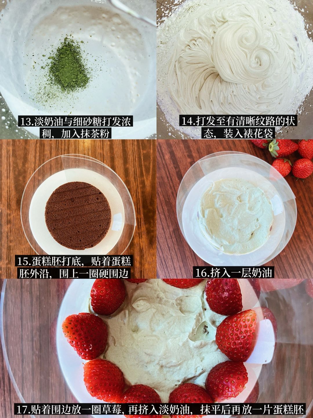 6️⃣蛋糕胚外面围上一圈围边,挤入一圈抹茶奶油,贴着围边放一圈草莓。挤入抹茶奶油抹平表面,再放一片可可蛋糕胚。抹上抹茶奶油,顶部用草莓装饰