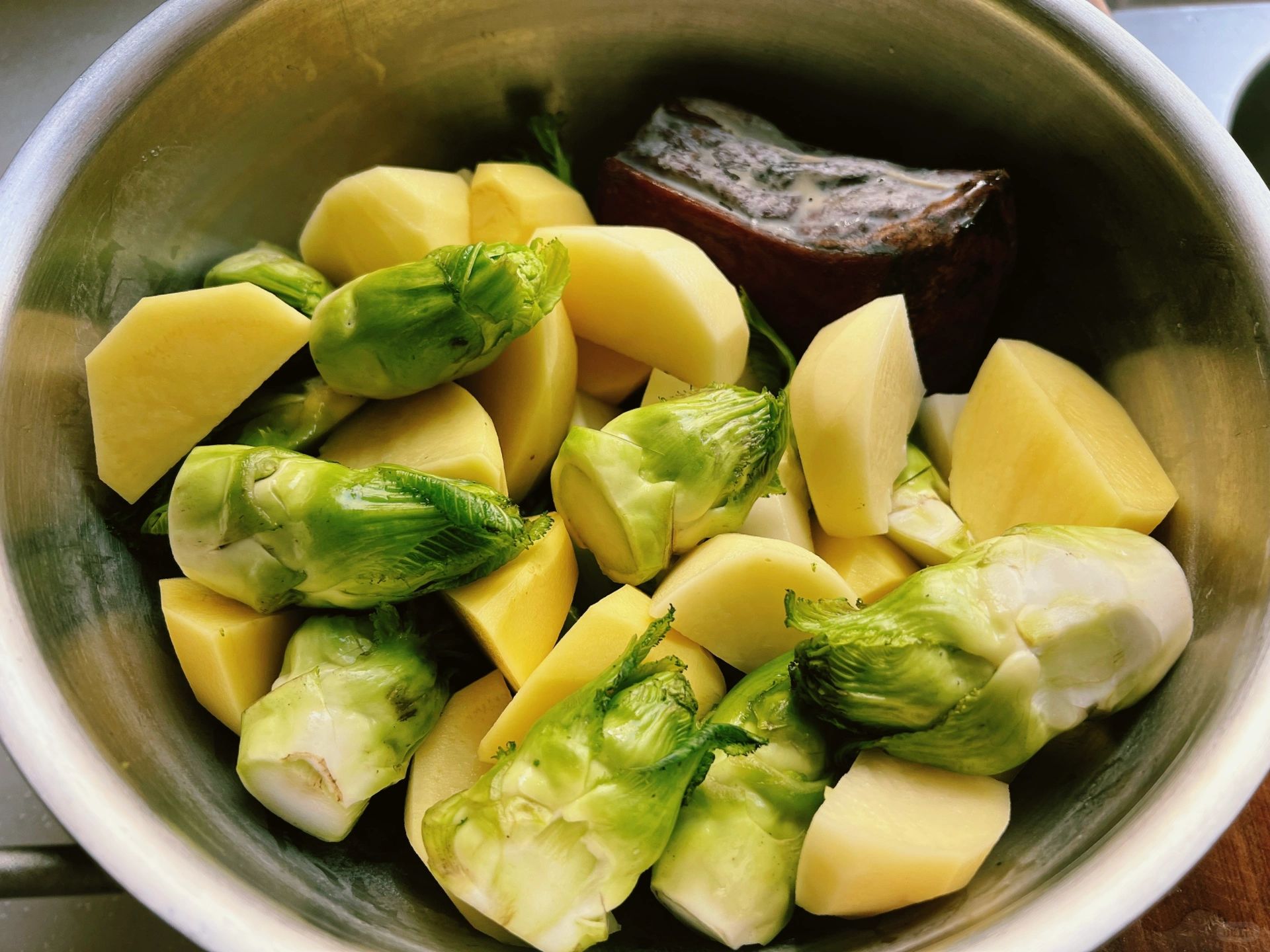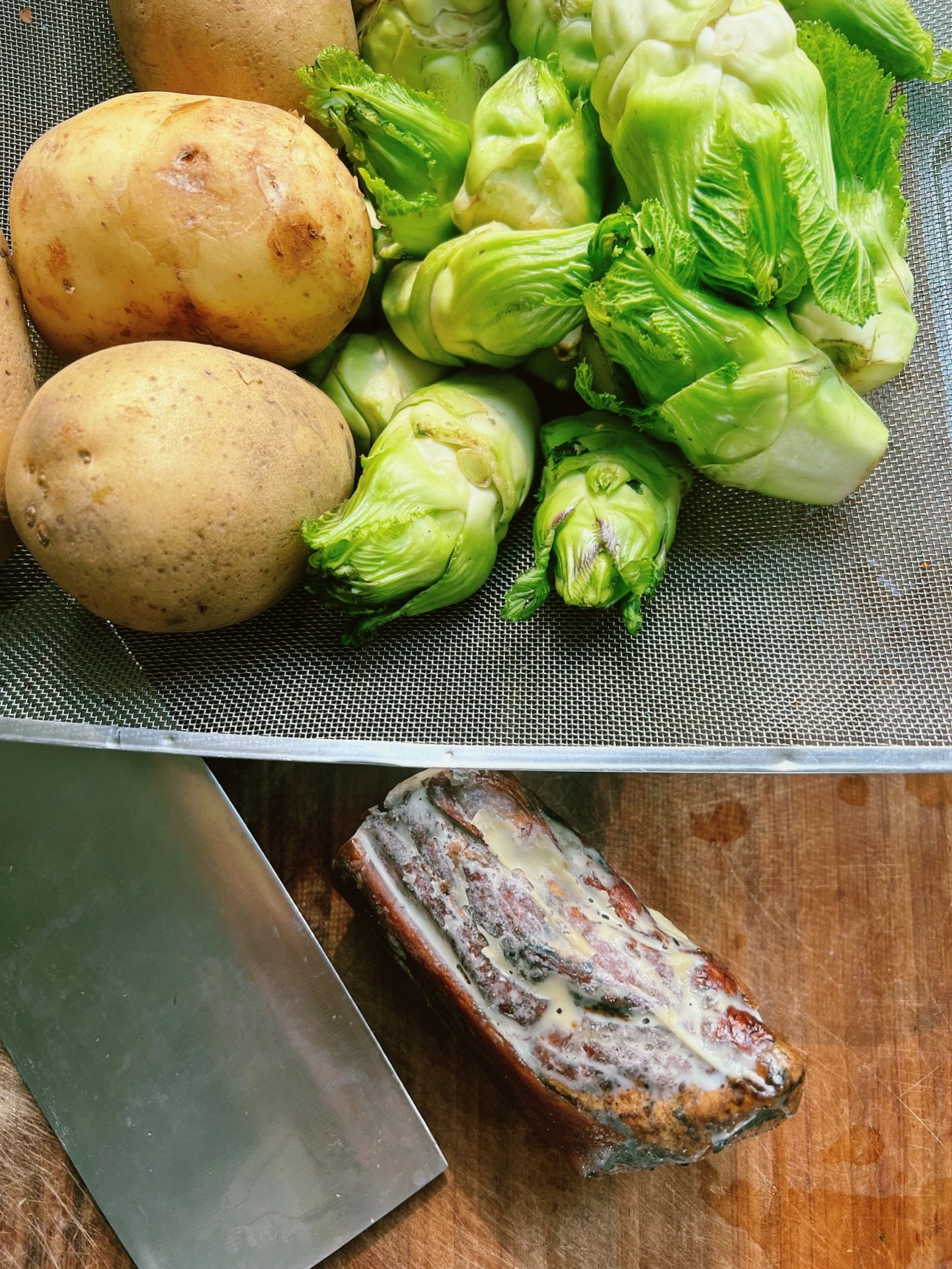 1⃣️把干净的腊肉备好,土豆削皮后切块,儿菜洗干净后大块的一分为二,较小的不用切🥔