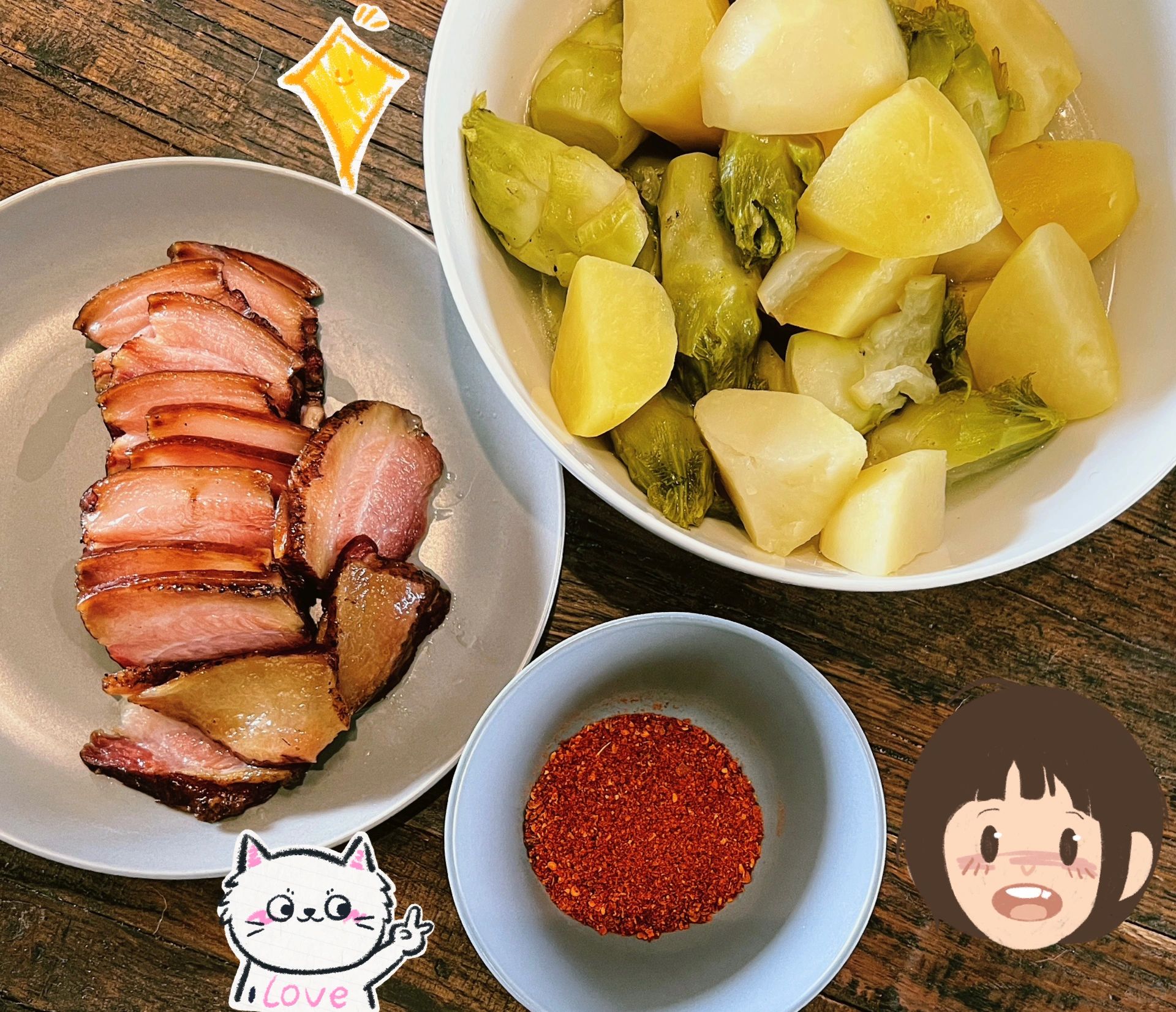 3⃣️水开后中火煮大概40分钟🔥儿菜和土豆煮软后捞出,腊肉切片。调一个自己喜欢的干碟或者蘸水。