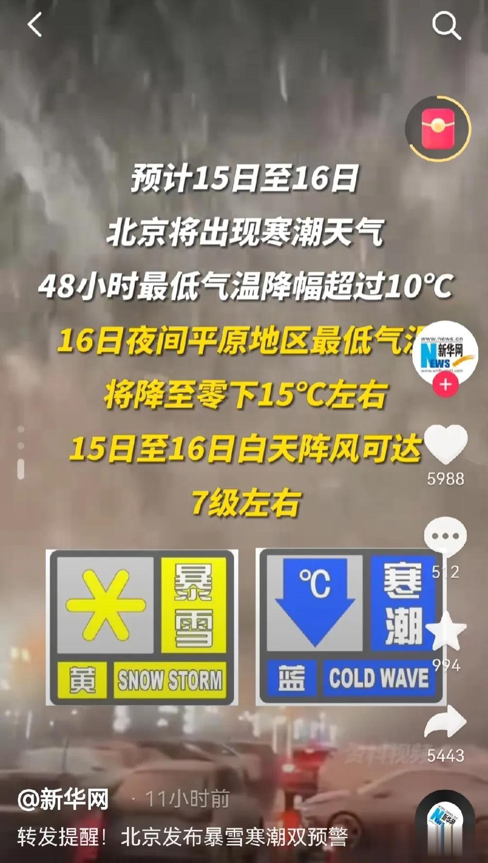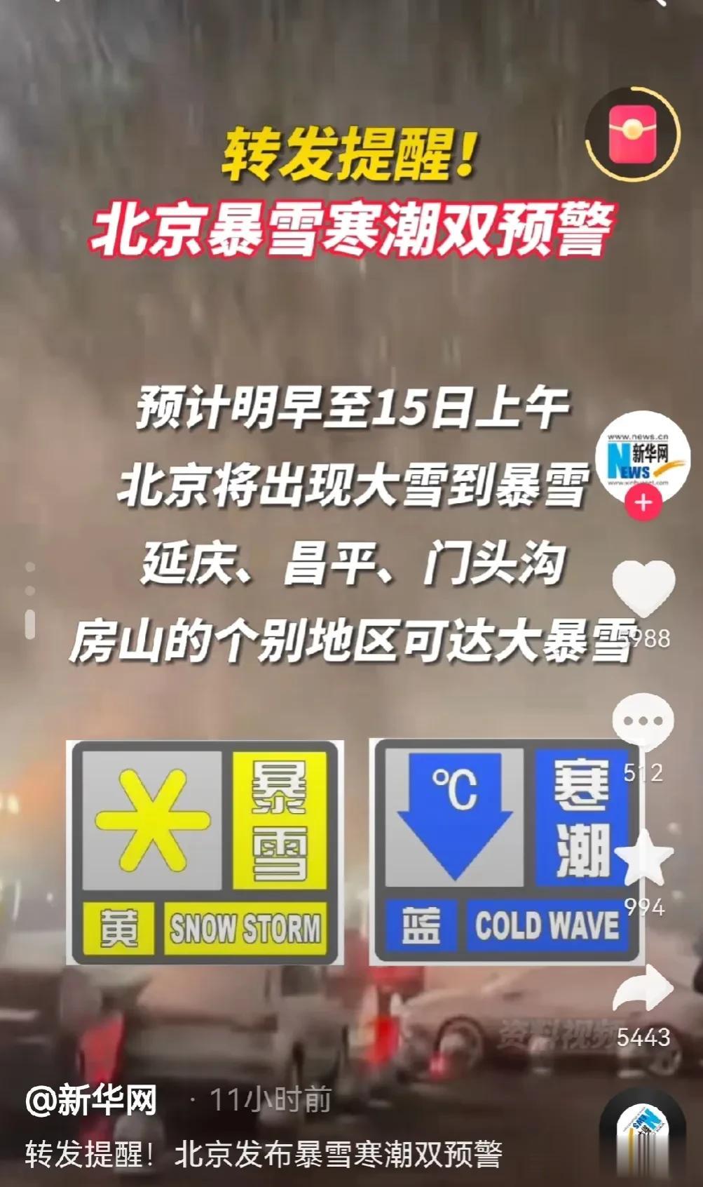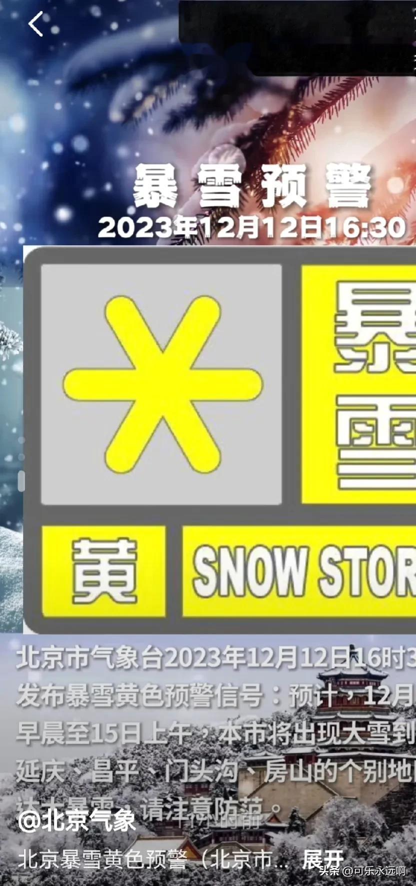 北京中小学生今天改到线上上课了。 市气象台2023年12月12日22时升级发布暴雪橙色预警信号。为保障师生的安全和健康,按照全市整体部署,市教委决定自2023年12月13日(星期三)开始,采取学生临时居家学习措施,范围为全市所有中小学、幼儿园、中等职业学校,具体到校复课时间待全市统一部署后另行通知。 #2023年度创作挑战#