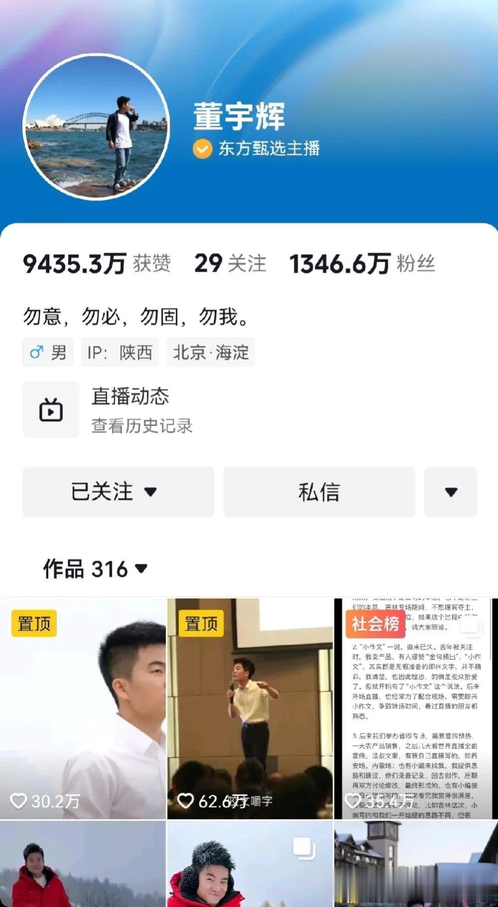 东方甄选方面表示,目前董宇辉仍然在为东方甄选工作,但近期应该不会上播。针对“小作文”事件,东方甄选方面表示,目前公司工作人员正在调查当中,后续信息会通过官方公布。东方甄选方面称,“这件事情影响也还是挺大的,董老师也需要一定时间调整一下状态,后续一定会给到大家一个答复。” 这两三天的功夫,董宇辉抖音号已经涨了40万粉丝了,一个朴实无华的农民儿子,善良如水,人品如山,才华如玉,用实际行动诠释了什么是知行合一!他不慕名利,不忘初心,身体力行,厚积薄发,带动全民读书,向善向上,厚德载物,挽救了出版业,推动了旅游业,助力了农业,深耕了教育业,反哺了家乡产业。