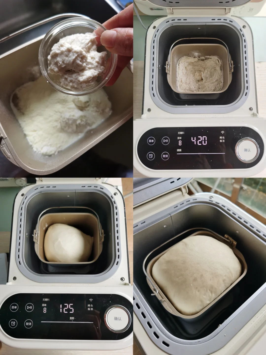 3. 在最后一次发酵即将结束准备烘烤前,观察一下发酵状态,如果还没发酵到位,有暂停键的面包机可以按暂停键,20分钟后按继续(注意不要发过了),等待烘烤结束即可。
