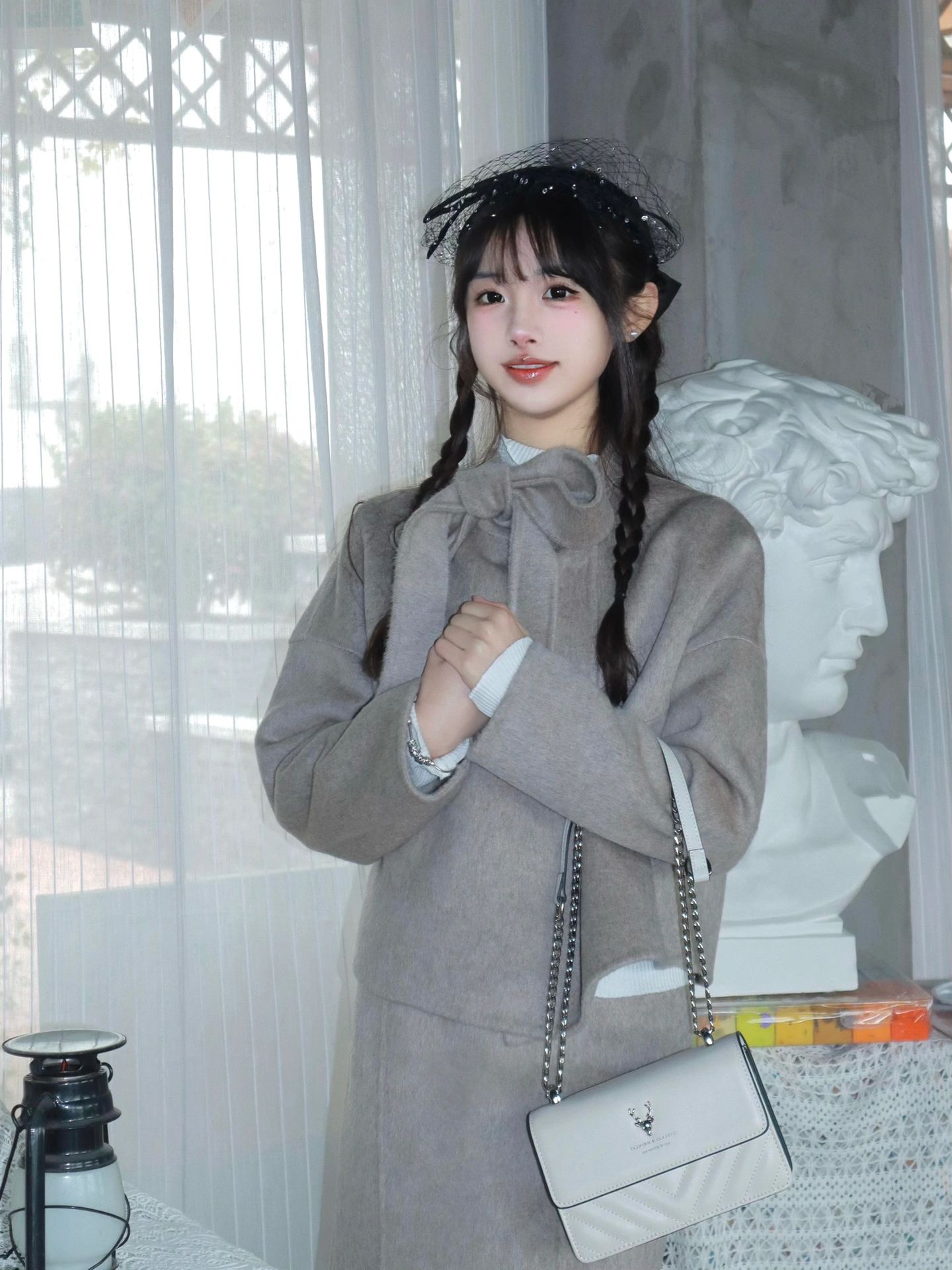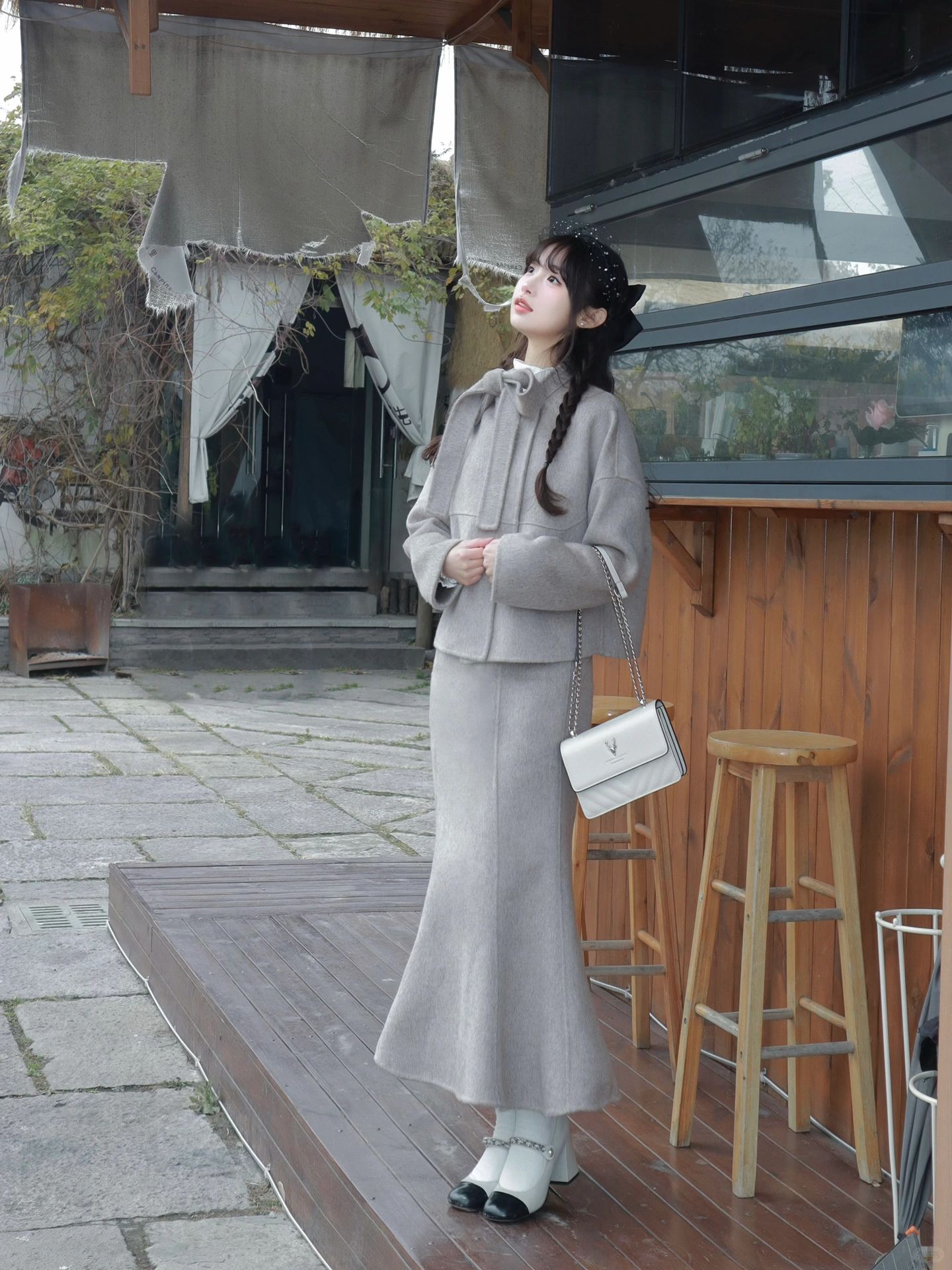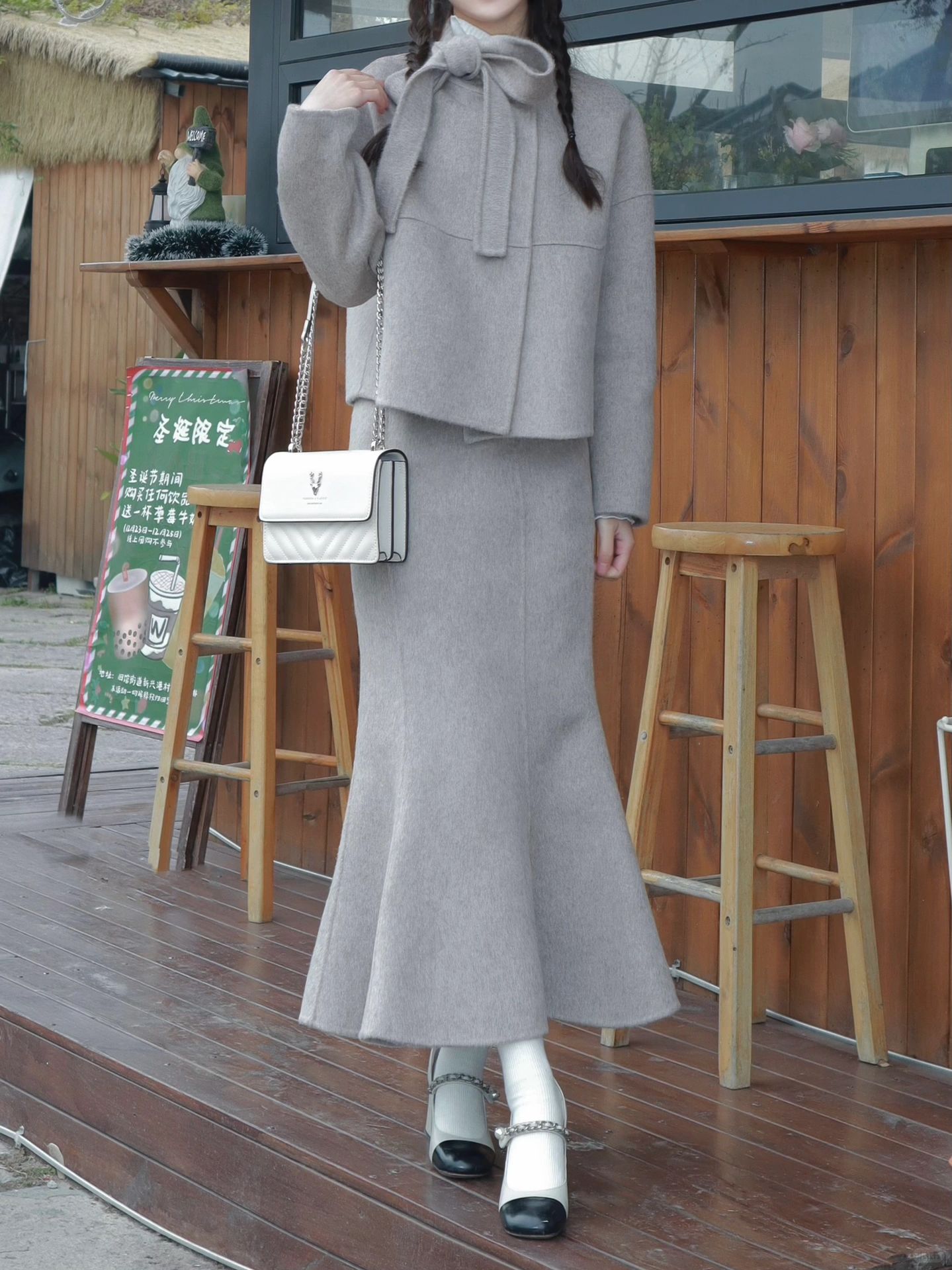 这一套太优雅了❕ 领口大蝴蝶结装饰➕鱼尾裙设计 双面毛呢材质▫️ 既美丽又保暖~