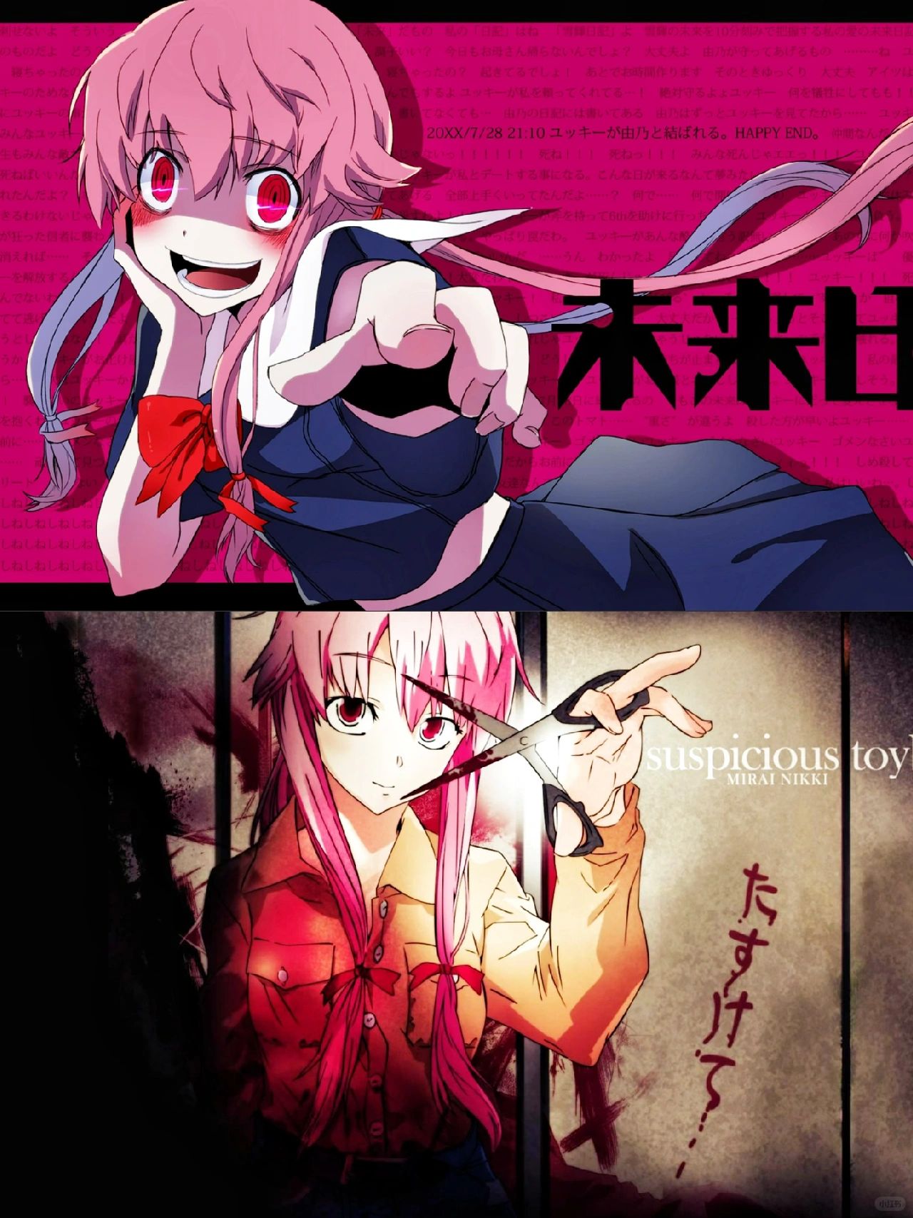 🐶本修勾说:动画的主线是成长和命运,天野雪辉从一个懦弱的逃避者,成长为一个勇敢的担当者,我妻由乃从一个扭曲的杀人狂,成为一个真正爱上雪辉的少女。剧情炸裂,典型的日式科幻文字AVG的风格,凭“成神”和“日记”等几个简单设定,突破常规生存游戏大逃杀的框架,用病娇由乃作为主战力,则是有效的逆转同类题材攻守关系。我妻由乃真简直就是病娇界天花板,粉毛姐姐我真的超爱‼️真的是一部不可错过的恐怖番🤩