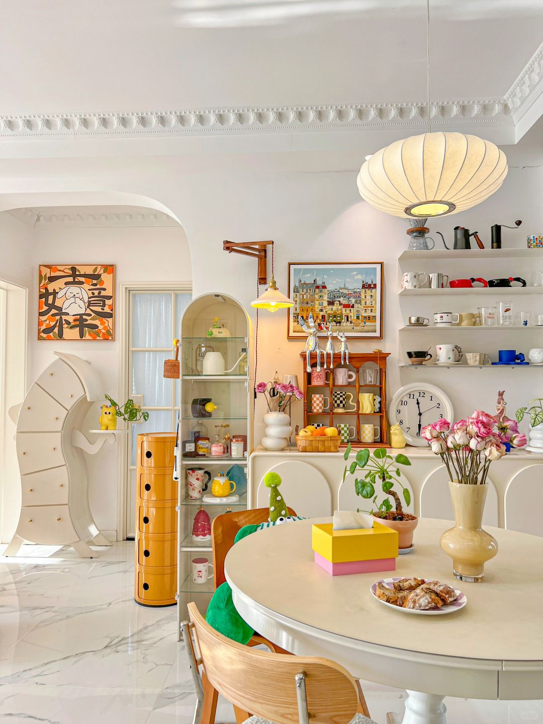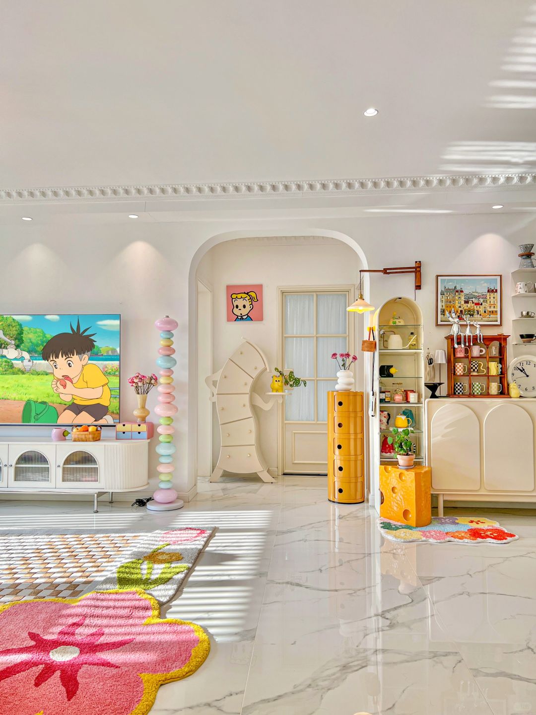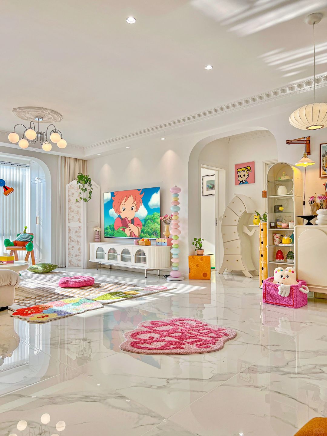 硬装只简洁的白色系 白色地砖+白色乳胶漆+白色木门 但的软装却被我装出了花 大件家具仍然以白色为主 但也有细节 客厅吊灯有蝴蝶结🎀造型 银白色灯身搭配灯盘 更有了法式复古的格调 搭配了各种彩色的软装 主要由粉色、木色、绿色 再加上和煦的阳光☀️ 让我的家充满了烟火气息