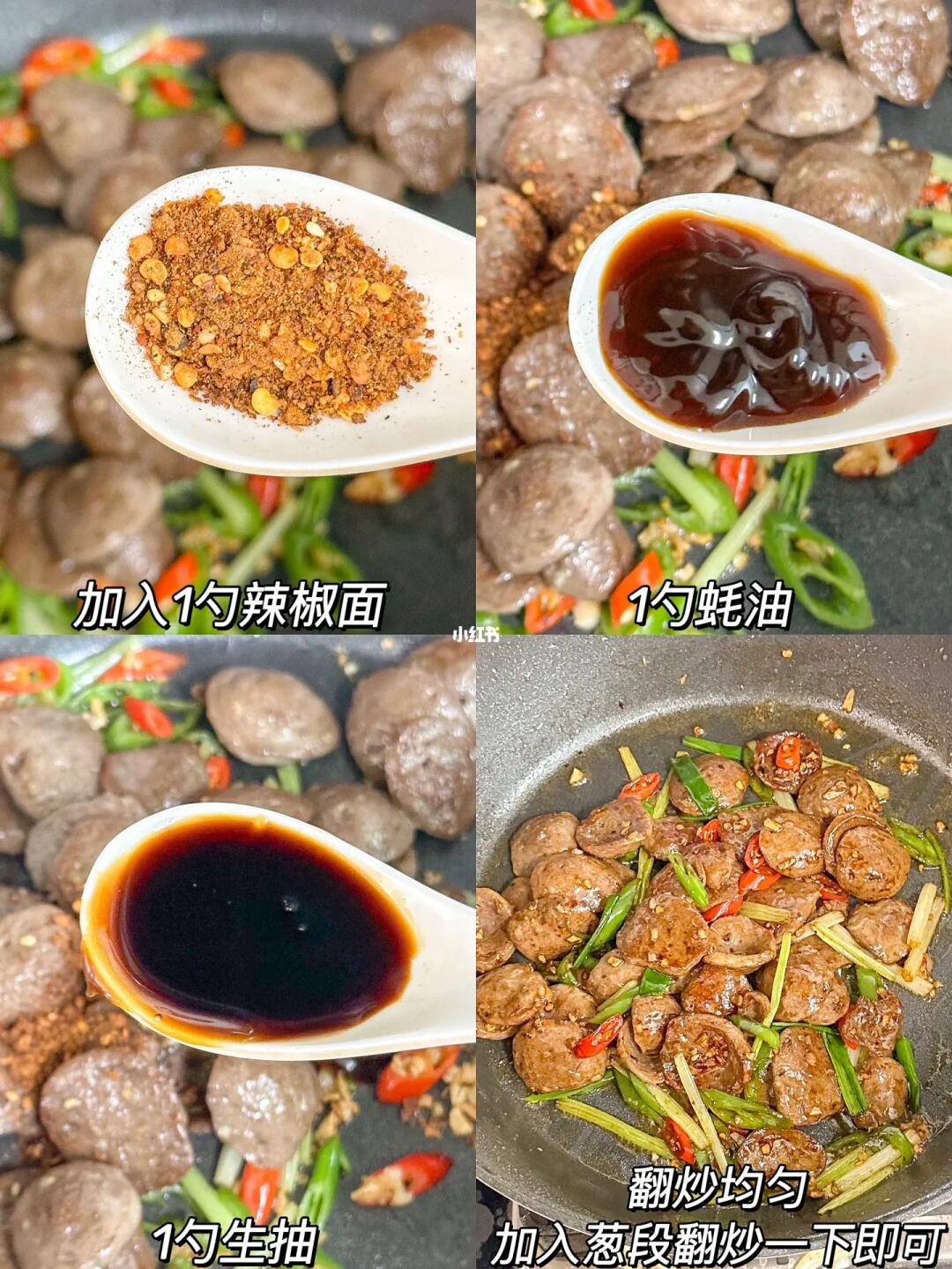 3、倒入牛肉丸,加入1勺辣椒面、1勺蚝油、1勺生抽翻炒均匀,加入葱段翻炒一下即可出锅