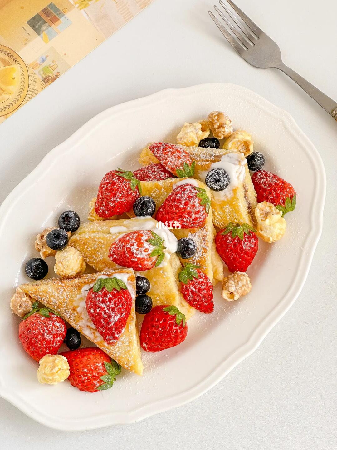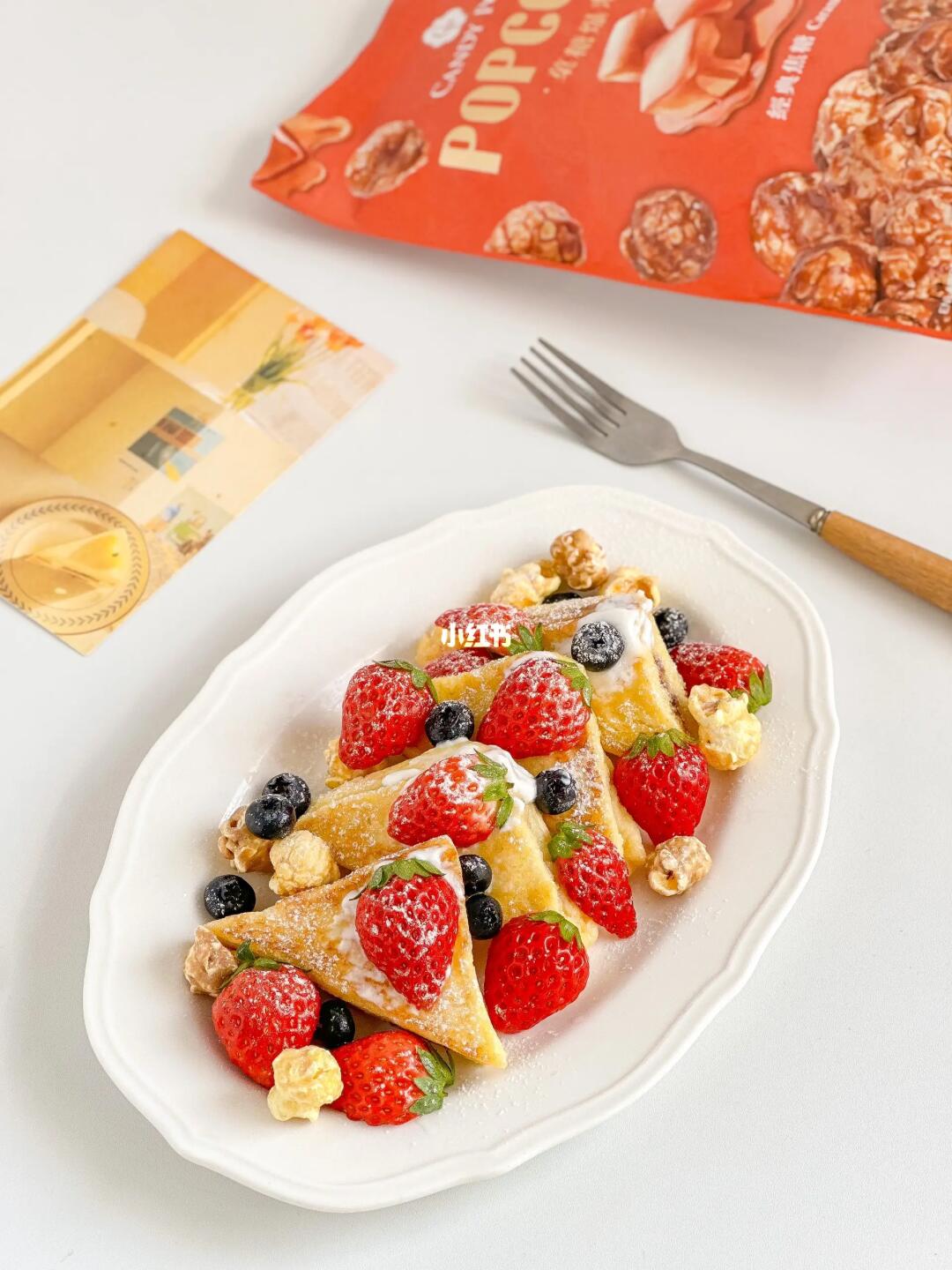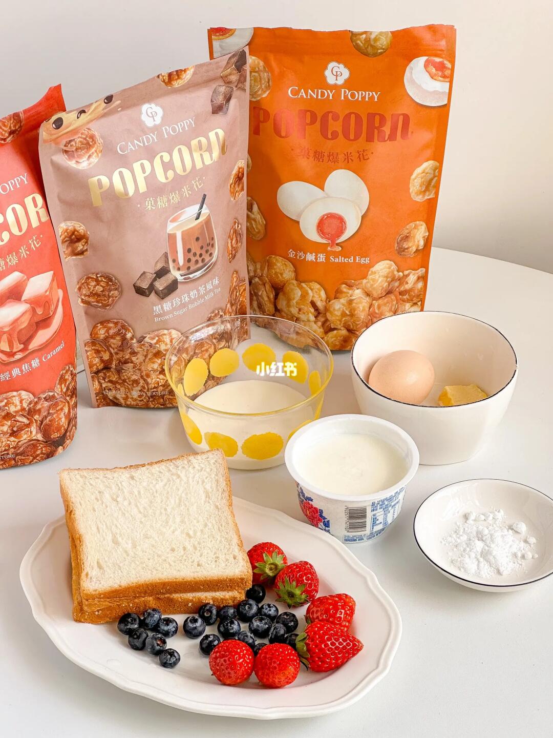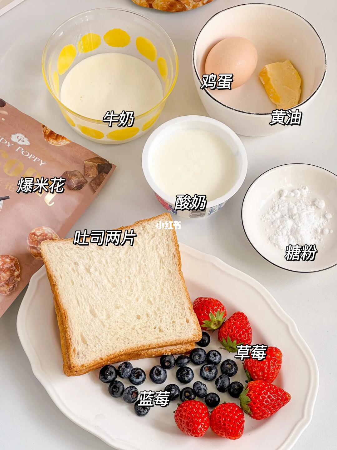 吐司2片、草莓、蓝莓、酸奶、牛奶、爆米花、鸡蛋、糖粉、黄油