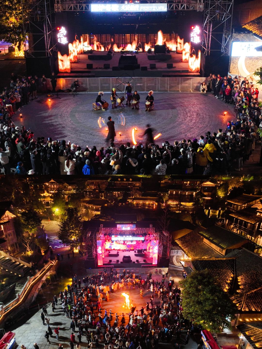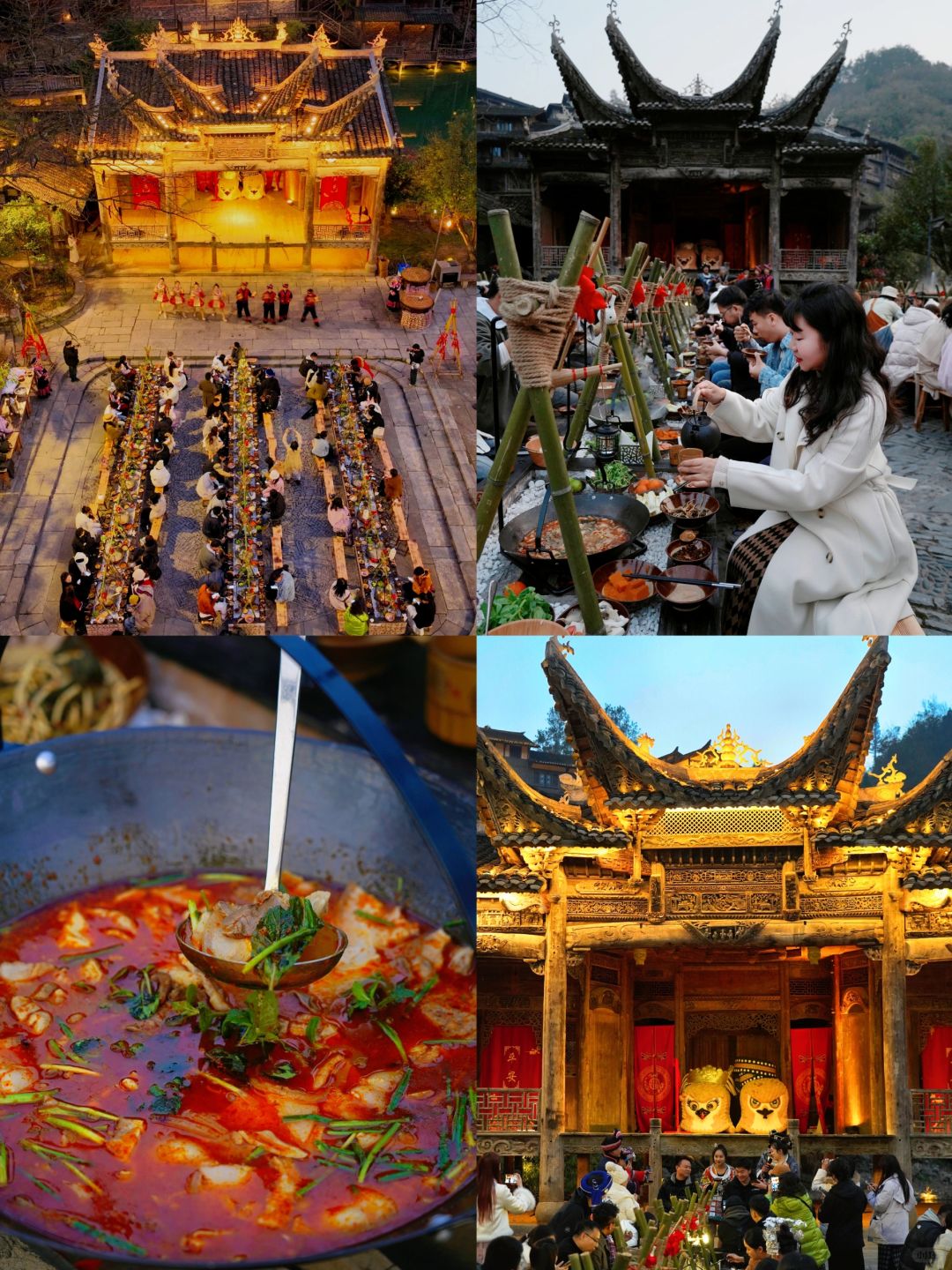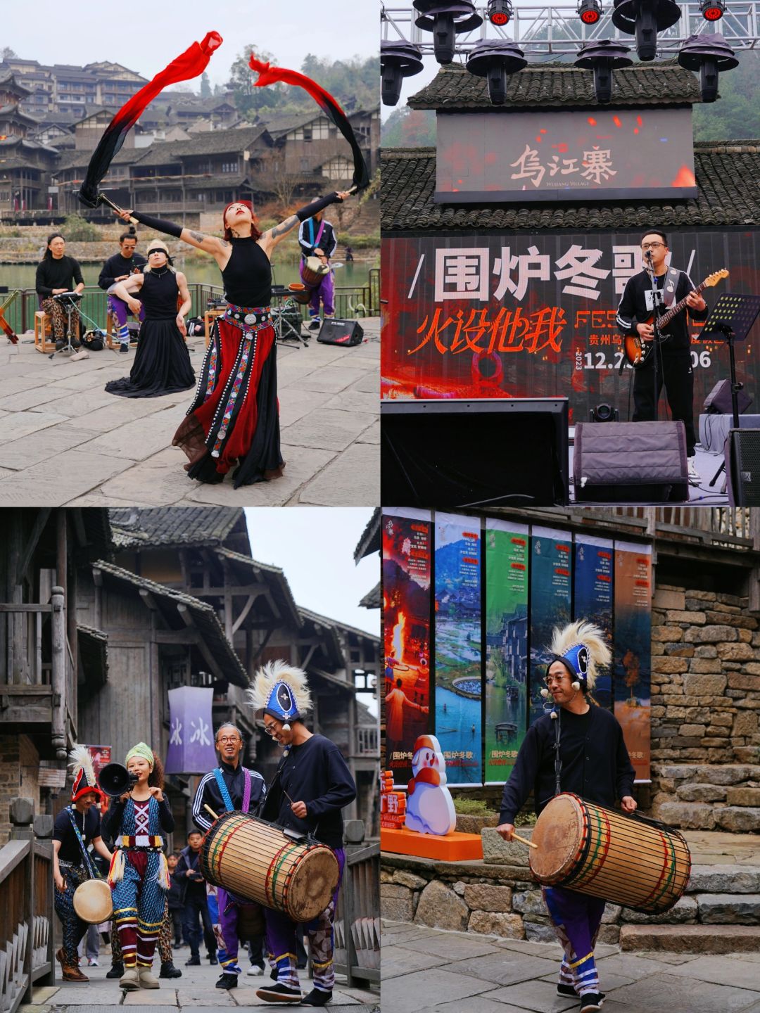清晨,乘一叶扁舟从水路开始丈量 随着船夫摇橹推出的水波阵阵涟漪 我也渐次翻开了乌江寨这副画卷 远处江面上,是踏波而行的独竹漂 冬日里的乌江寨,虽有几分寒冷 却因围炉冬歌而有了不一样的热情 非洲鼓巡游、民族打击乐、乐队演出…… 当爵士电音,遇上少数民族山歌 又会碰撞出怎样的音乐灵感呢? - 【2天1夜这样玩】 Day1:遵义➠ 乌江寨➠ 独竹漂表演➠ 廻龙岛围炉冬歌大舞台看节目➠ 吊锅宴➠ 掌灯仪式➠ 音乐水舞秀和无人机表演➠ 火舞秀➠ 篝火电音派对 Day 2:游船➠ 体验花草纸、扎染、竹编花灯、通草堆画➠ 围炉煮茶➠ 返程 - 【冬季限定游玩项目】 🫖陶罐烤奶茶:一群朋友围着炉火,煮上一壶暖暖的奶茶,一边喝奶茶一边听脱口秀演员讲段子,幸运的话还能遇上民族弹唱,那就更有趣啦! 🎶 乐队演出:不同风格的乐队,带来了不同的音乐。逛到廻龙岛,围炉煮茶听听歌,感受一下音乐带来的热情。 【冬季限定特色餐饮】 🔸吊锅宴: 古戏台前的吊锅宴,一排排吊锅煮着的酸汤火锅沸腾着。四方游客齐聚在此,一边享受着美食,一边参与着少数民族的竹竿舞、和那独具特色的饮酒习俗,感受着少数民族的热情 🔸龙虎斗茶艺:夜幕降临,民谣酒吧前的空地上,围炉煮茶聊着趣事,还能将乌江寨的夜景一览无遗。 在这儿还能看到纳西族的龙虎斗,当冷酒与热茶相遇时,那悦耳的响声寓意着吉祥,一口酒、一口茶…迷醉在这朦胧夜色里 - 【景区指引】 📍贵州省遵义市播州区尚嵇镇乌江寨国际旅游度假区 🎟日游票(9:00-16:00)80r;夜游票(16:00-22:00)120r tips:入住景区旗下酒店/民宿可免门票哦