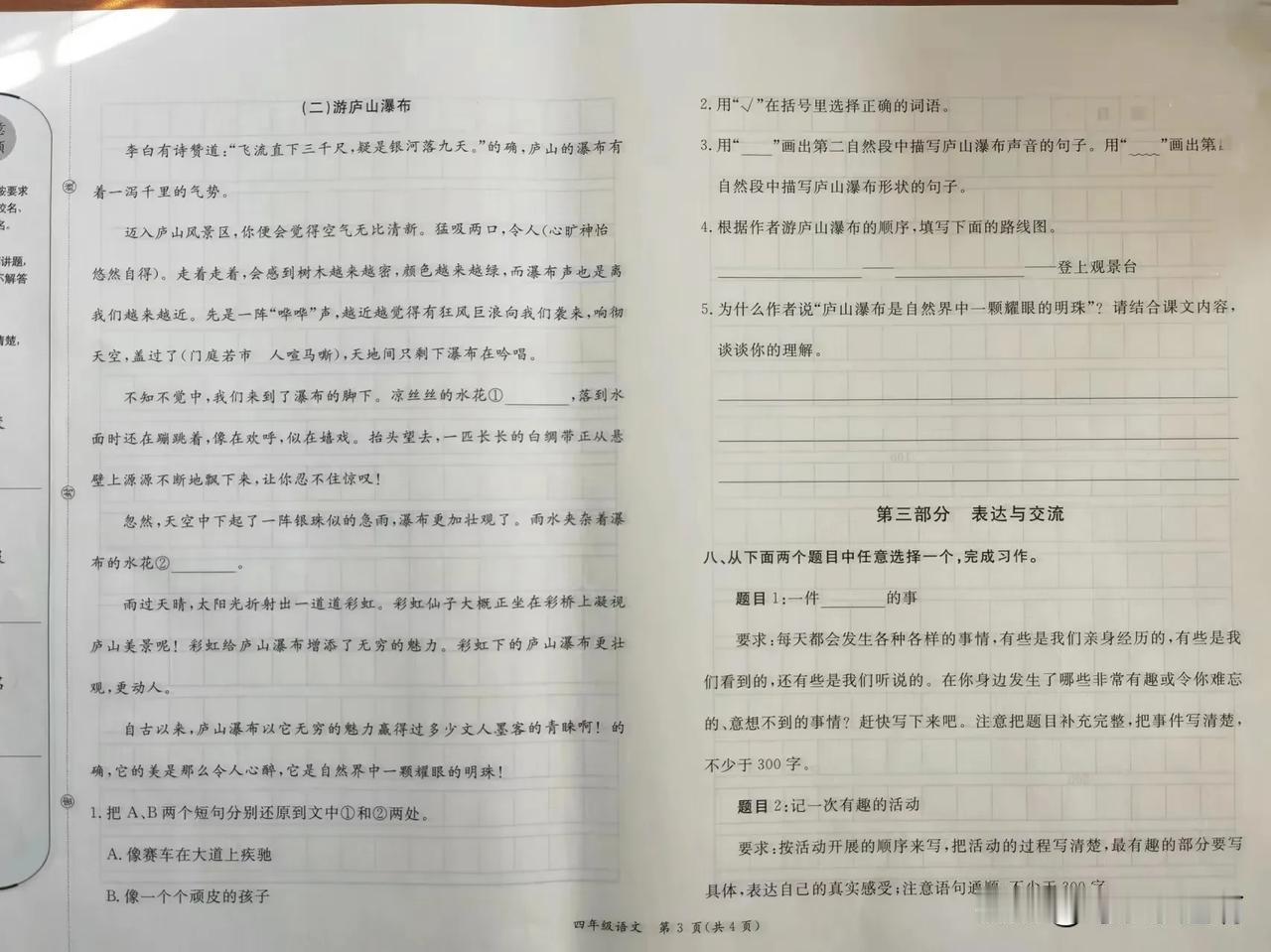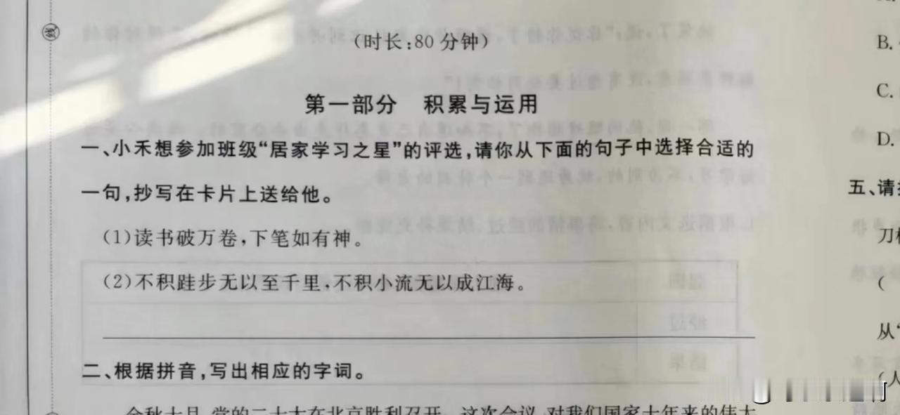 四年级期末考试开始了,坐标通州区。 大家来看看语文题难不难,第一题就把我难住了。 小禾想参加班级"居家学习之星"的评选,请你从下面的句子中选择合适的一句,抄写在卡片上送给他。 (1)读书破万卷,下笔如有神。 (2)不积跬步无以至千里,不积小流无以成江海。 感觉哪句都可以啊?你们觉得呢?