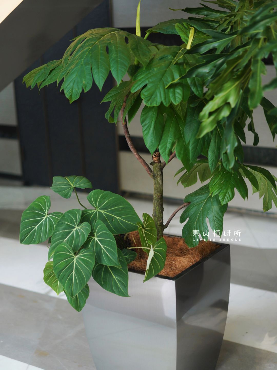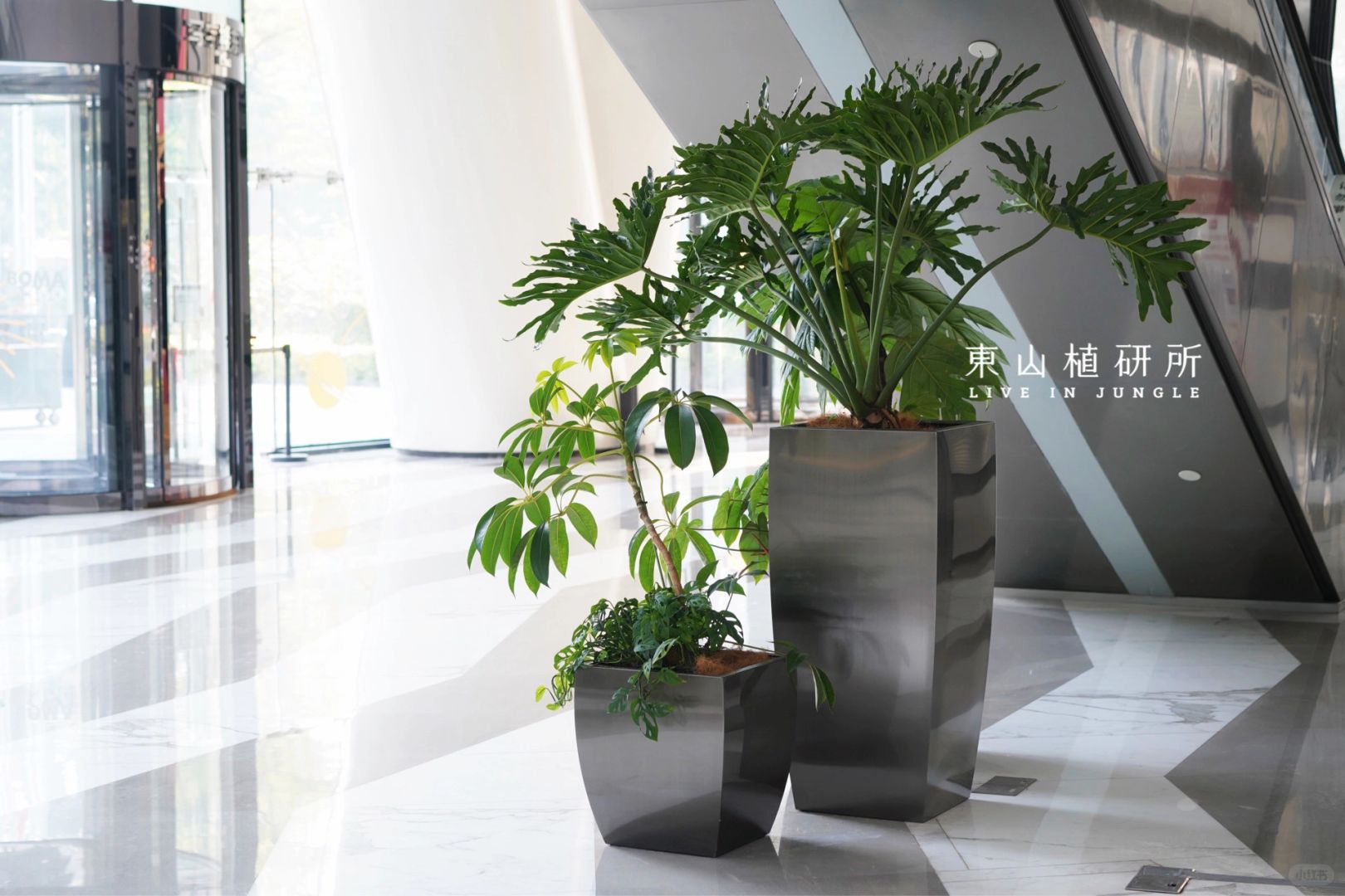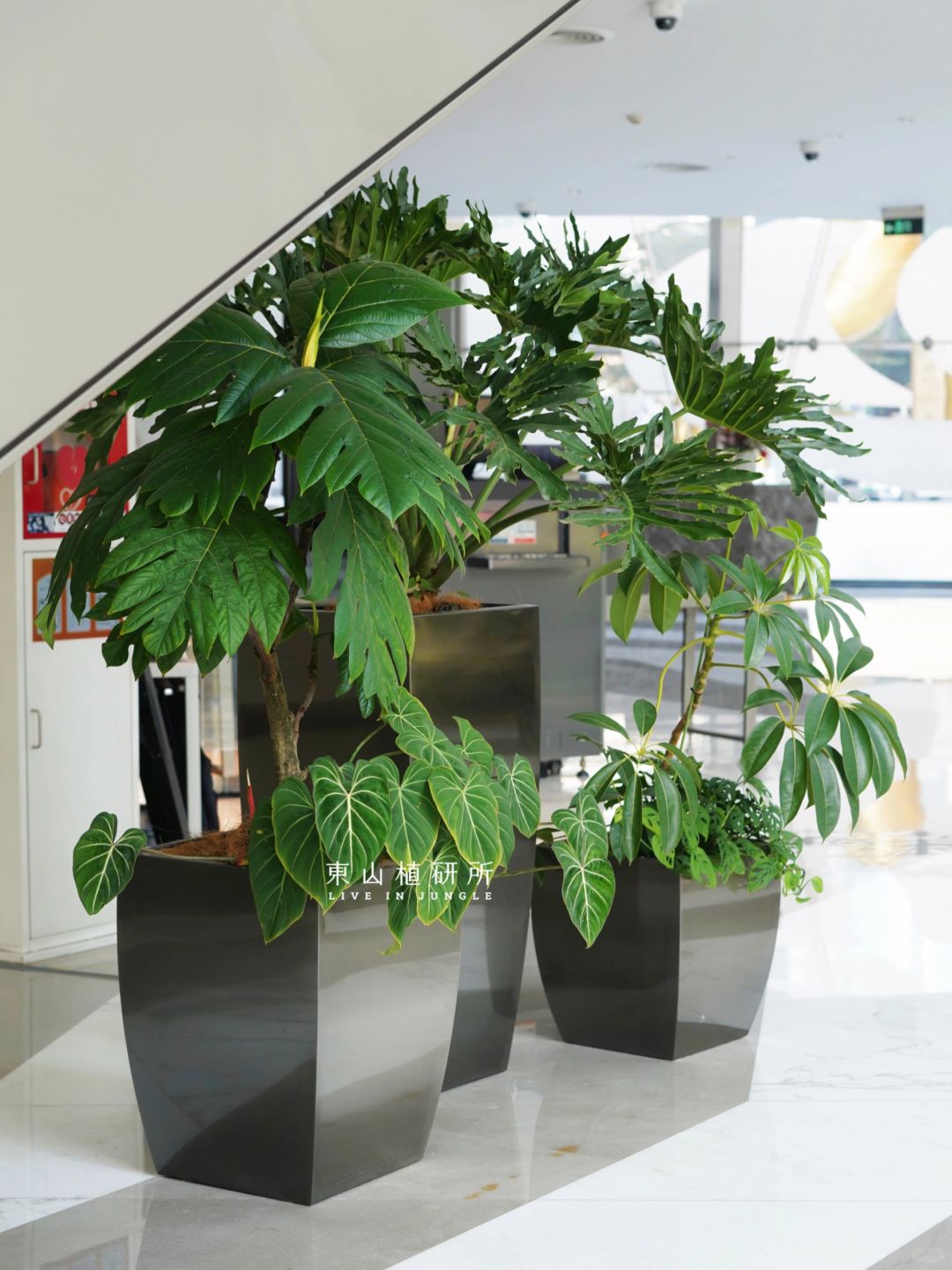 充满商务风的植物组景 结合室内环境订制的银色花盆 搭配叶片独特的的绿色植物 整个植物组景摆放在一个室内环境中 为商业空间增添自然的气息 植物清单:明脉蔓绿绒/龙鳞春雨/大叶伞/面包树等 ——————