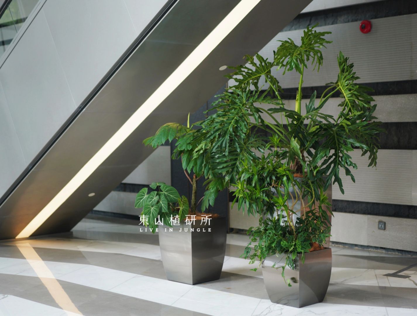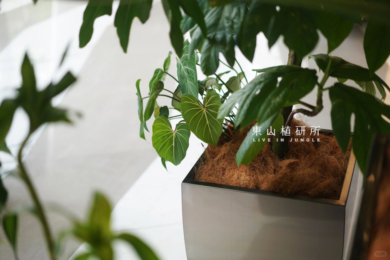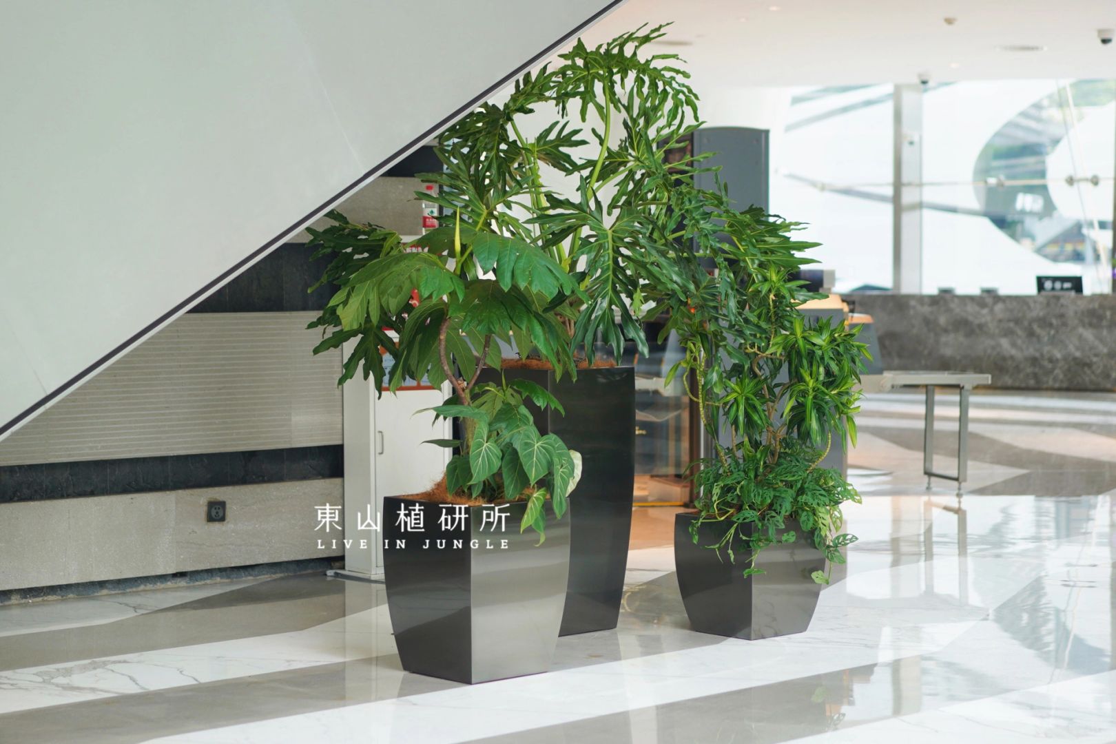 充满商务风的植物组景 结合室内环境订制的银色花盆 搭配叶片独特的的绿色植物 整个植物组景摆放在一个室内环境中 为商业空间增添自然的气息 植物清单:明脉蔓绿绒/龙鳞春雨/大叶伞/面包树等 ——————