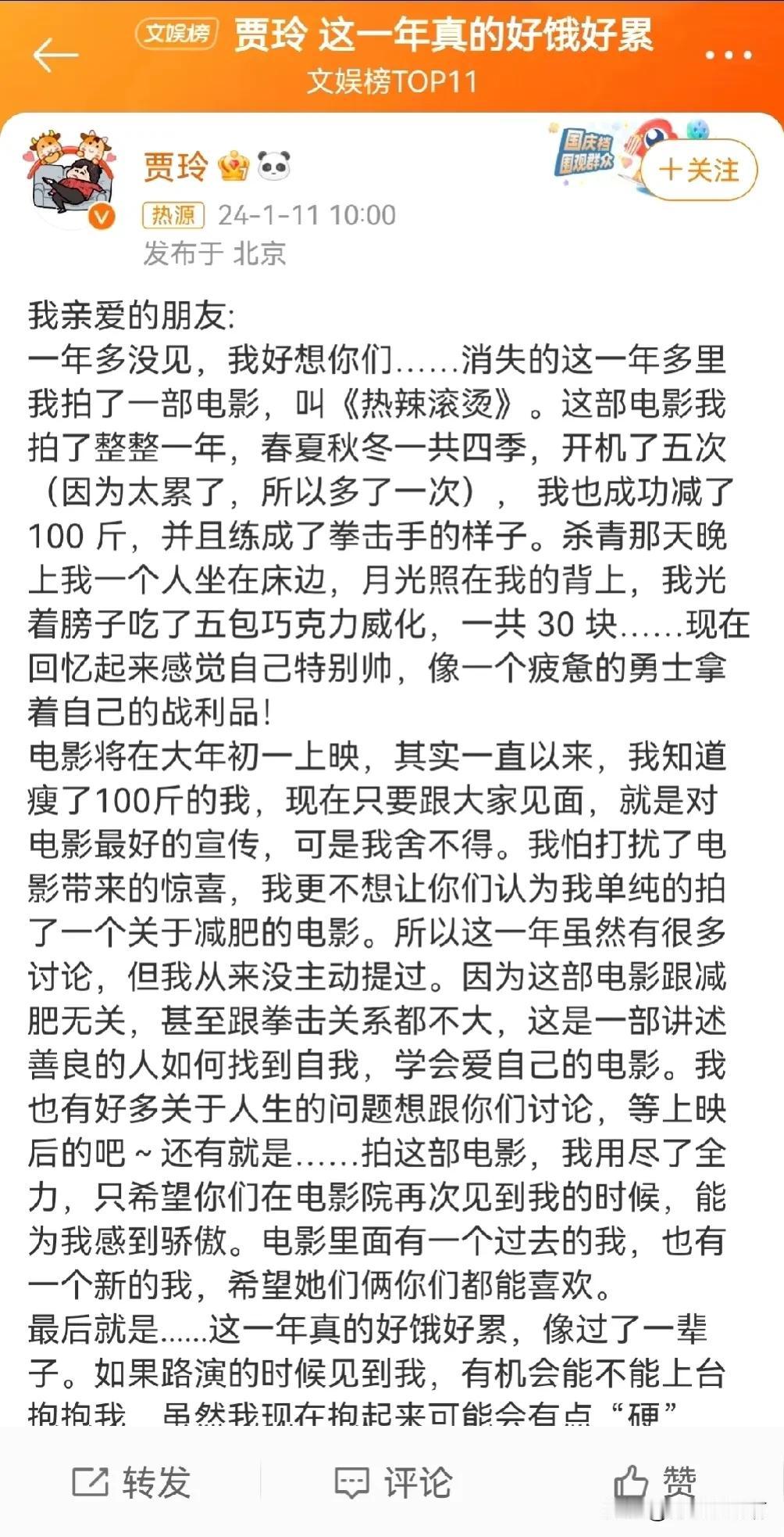 电影《热辣滚烫》宣布定档2月10日大年初一,这是继《你好,李焕英》之后,贾玲时隔三年以导演身份回归。导演&主演贾玲发文畅聊电影幕后故事和心路历程。她感慨:“这一年真的好饿好累,像过了一辈子。”为了这部电影贾玲减重100斤,“练成了拳击手的样子”。杀青那天她一口气吃了五包巧克力威化,“像一个疲惫的勇士拿着自己的战利品” #贾玲新剧瘦身# #贾玲#