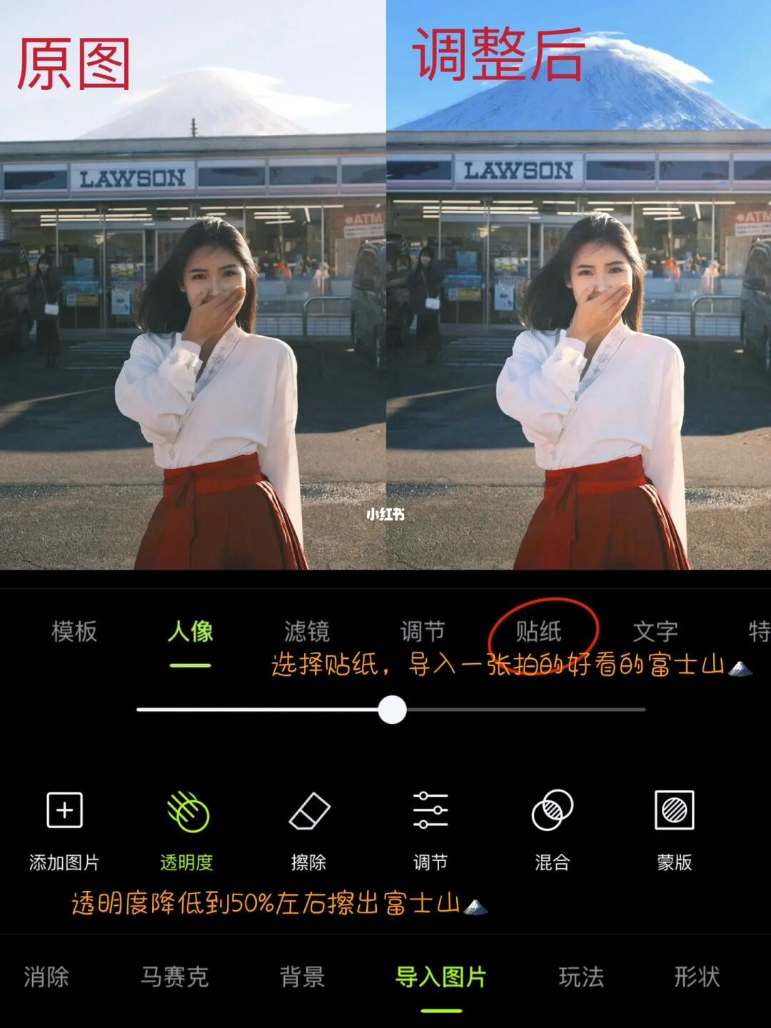 透明度降低到50%左右,开始擦,擦出的富士山放到合适的位置
