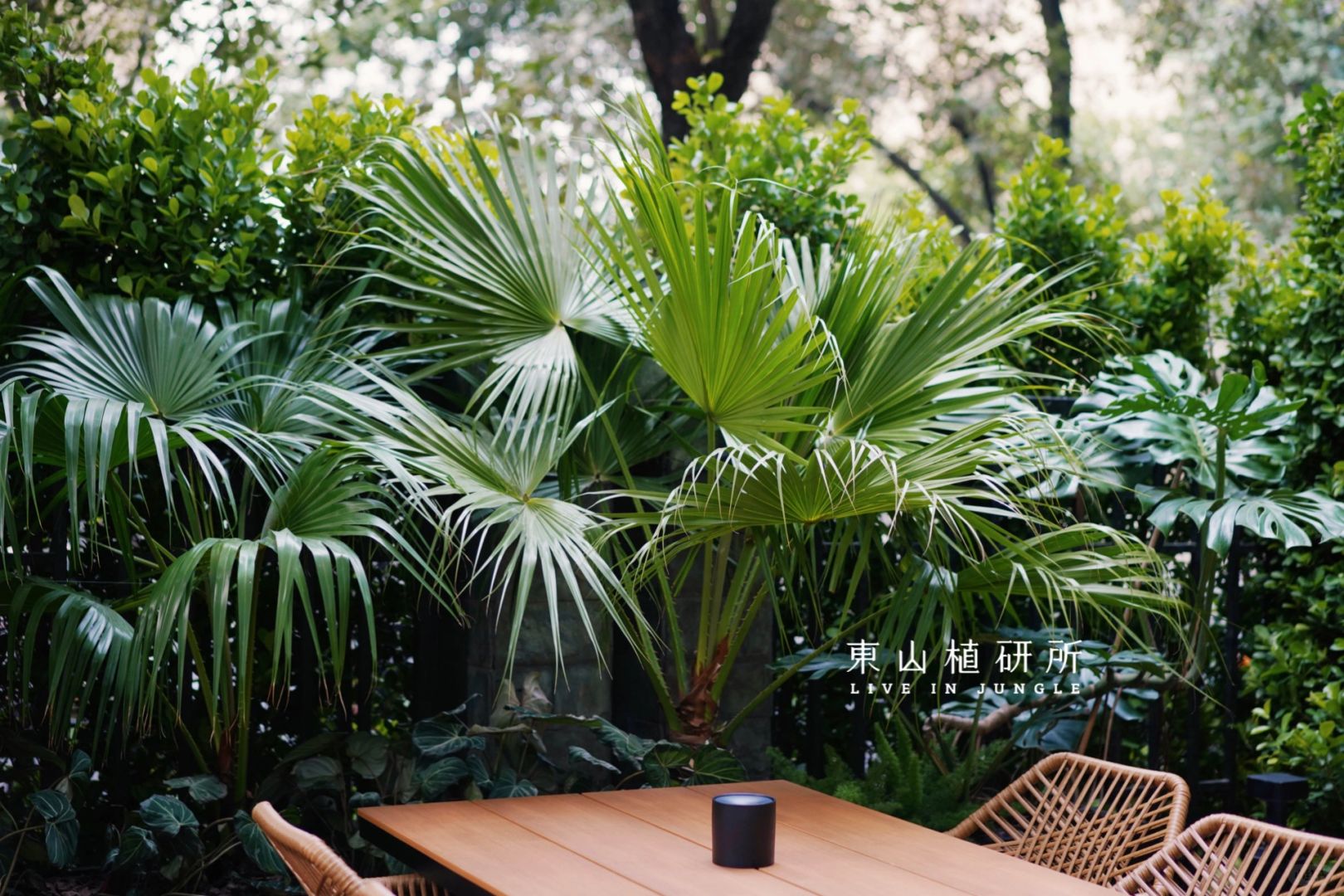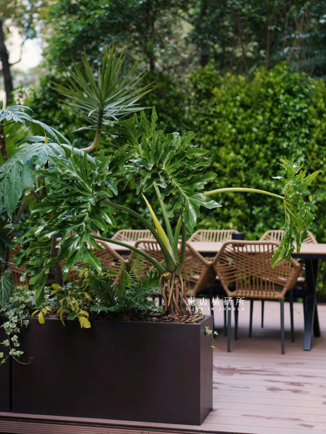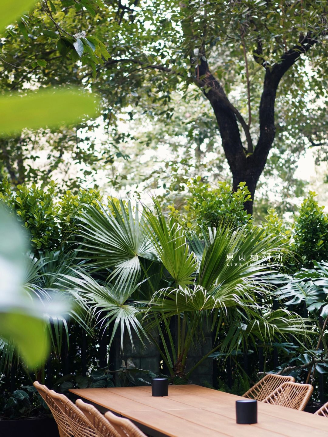 透过相机与自然对话 蒲葵和龙鳞春羽叶片交错 舒展的叶子 清晰的脉络 热带绿植让人置身于大自然的怀抱 午后阳光透过树叶洒在木桌和藤椅上 整个场景充满温暖的氛围 微风拂过 叶子轻轻摇曳 坐在户外感受植物营造的宁静 慵懒 舒适 偷得浮生半日闲 场地:德园 · 私人会所 设计:东山植研所 ——————