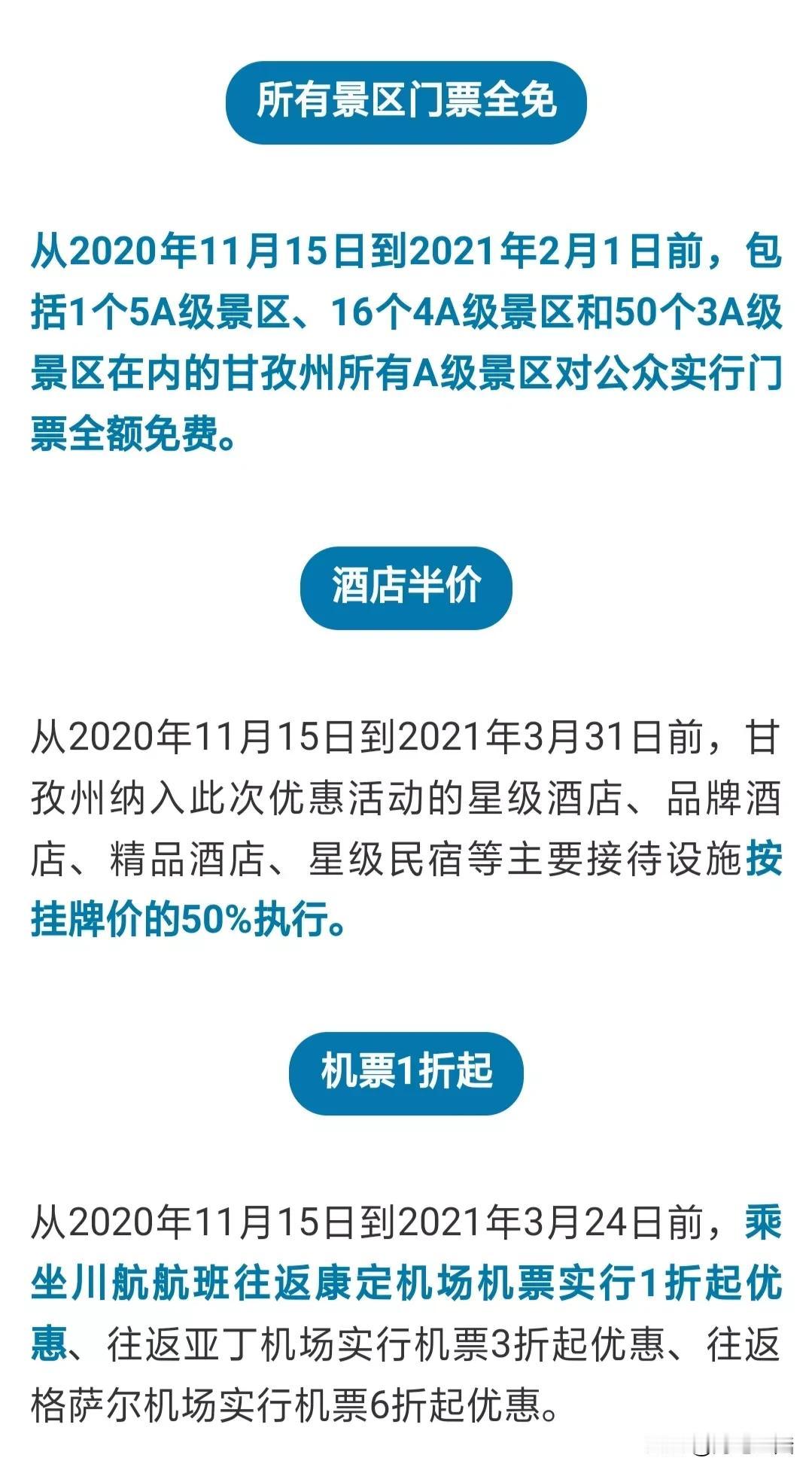 前些日子给大家分享了“冬游西藏”的免票政策,湖北的免票政策,很多朋友已经踏上了旅程。 四川甘孜的免票政策也来了! 67个A级景区门票全免,酒店半价,机票打折 一直持续到明年的2月1日 不知有多少人已经踏上“偶遇”丁真的路途上 如果近期你有什么旅游计划,甘孜也可以放在行程里了!