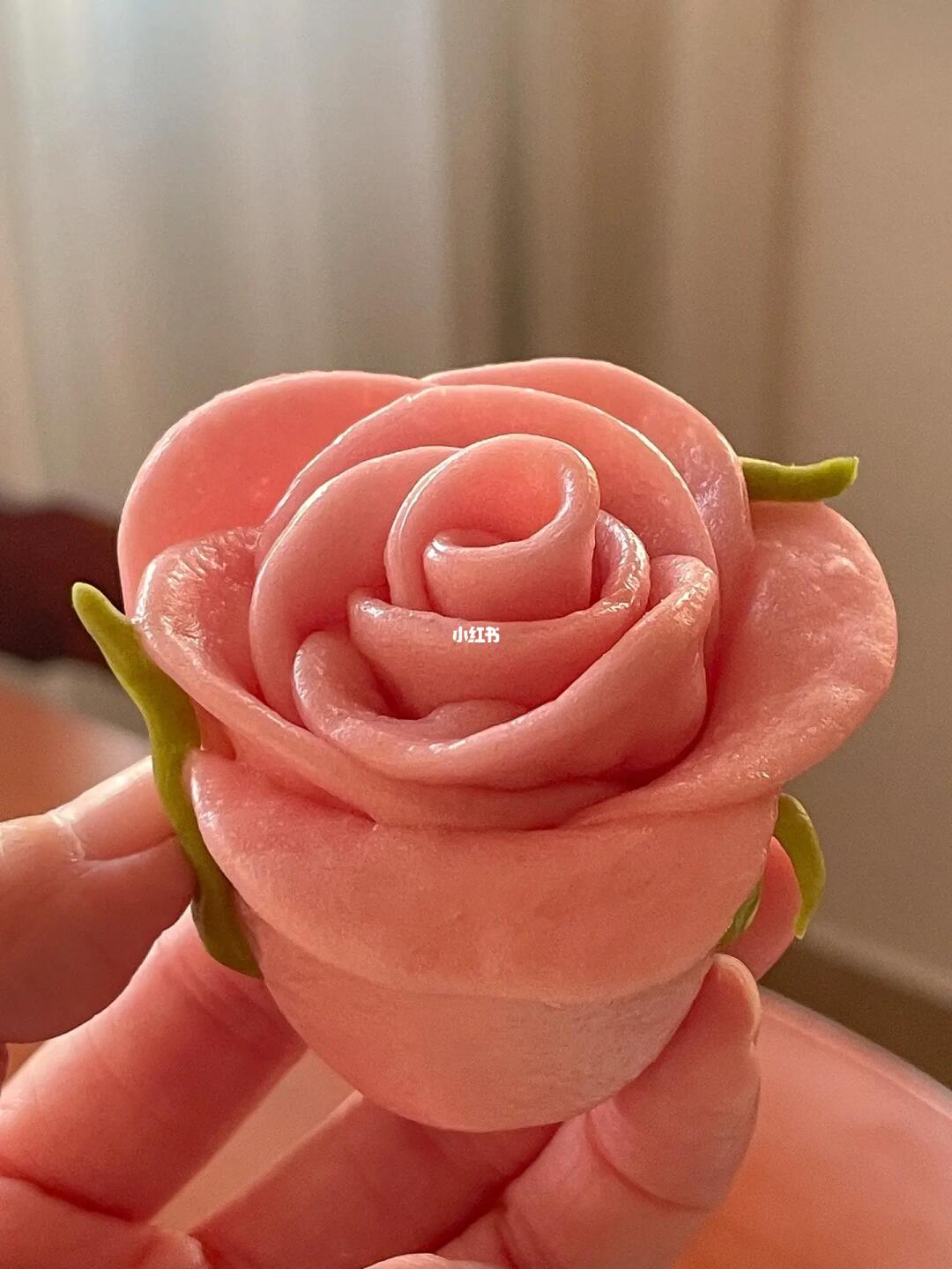 4️⃣玫瑰芯:将面片卷起来,然后将面片刷上薄薄一层水,一片一片贴上去,贴完后整理一下形状和叶片