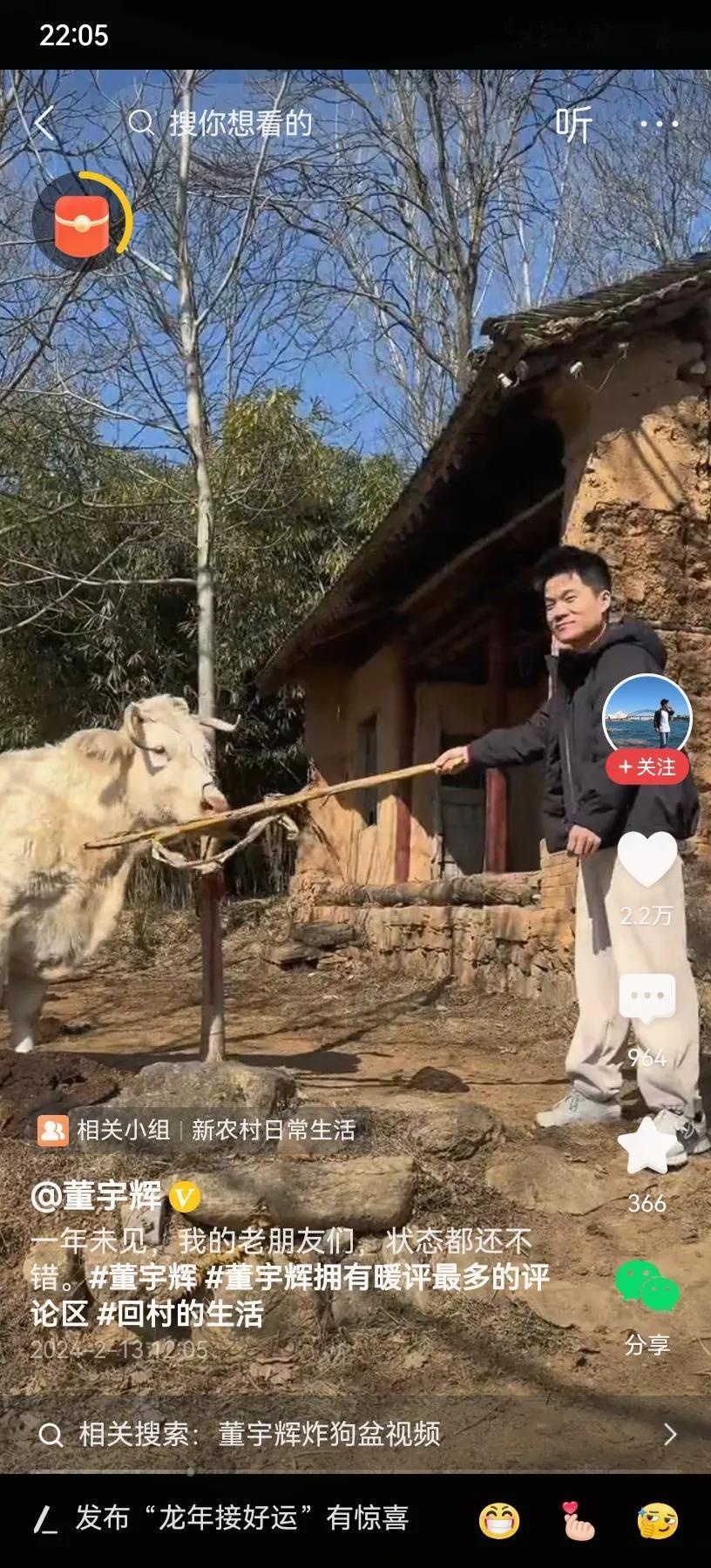 笑不活了,董宇辉的老友们出来了,你猜猜有哪些。 一条白色的大牛。 一条黑狗。 这就是你一年没见的朋友吗? 春节期间,除了董宇辉自己发了几个动态,网上基本上没有他的过年片段。 他的老乡真的是一点都没有发他的视频,没有蹭热度。 这样淳朴善良的乡村,难怪能走出如此优秀的宇辉。 在外面多风光无限,回到了老家还是大家熟悉的,从小被妈妈老是追着打的董宇辉。#我来唠家常#