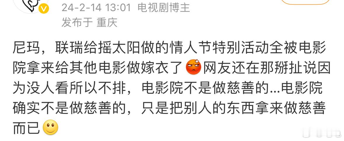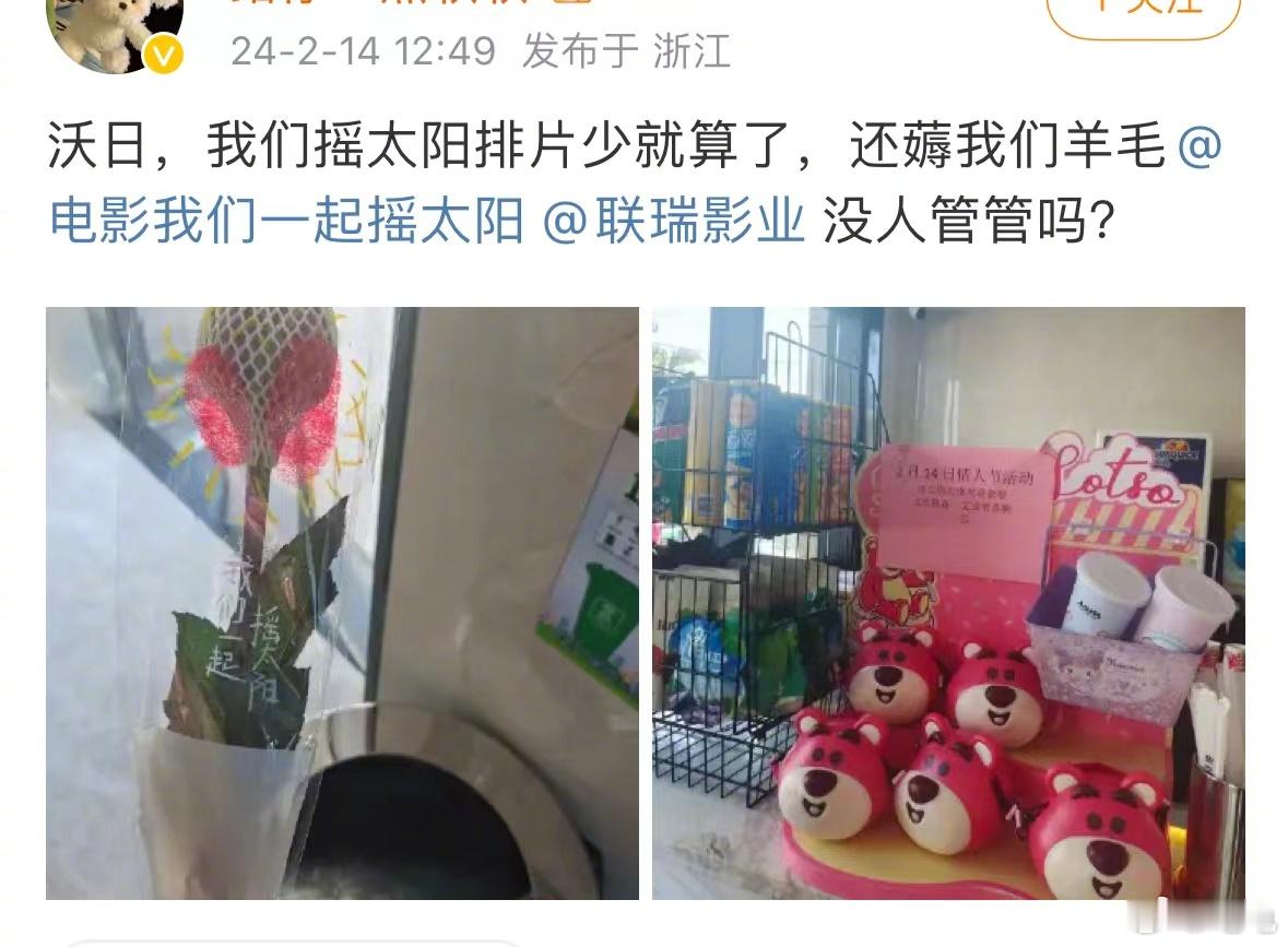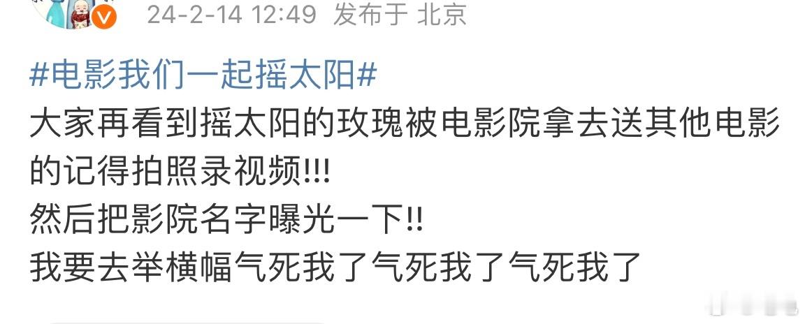 #情人节想看我们一起摇太阳没排片# …春节档欠摇太阳的,情人节该还了吧,高口碑低排片量,好电影却没办法看到,有心无力,还有些影院很过分私自将电影专为情人节配送的玫瑰花和喜糖送给别的观众!#心疼我们一起摇太阳#