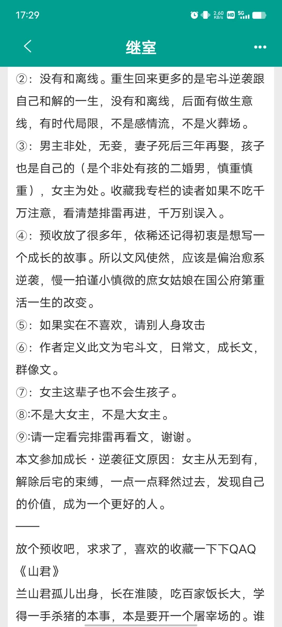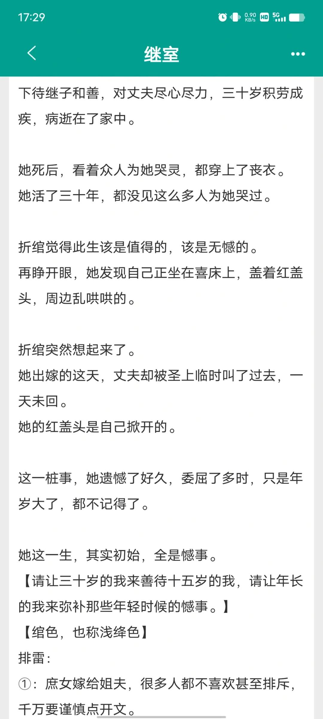 《继室》by枝呦九 刚完结的新文,一共105章 女主上辈子嫁给姐夫,一心为家里付出,善待继子,却活得十分憋屈,积劳成疾早早离世。重活一世,走出了宅院,看到了更广阔的天地,把自己重新养一遍。评论区好几篇长评都写的很好 几个亮点或雷点: 女主依旧嫁给了姐夫,男主有儿子,所以不是c 没有开金手指,没有玛丽苏,女主对男主没啥感情 女主没有生孩子,重生没有和离但有自己的事业 不是大女主,偏群像宅斗文,没有火葬场