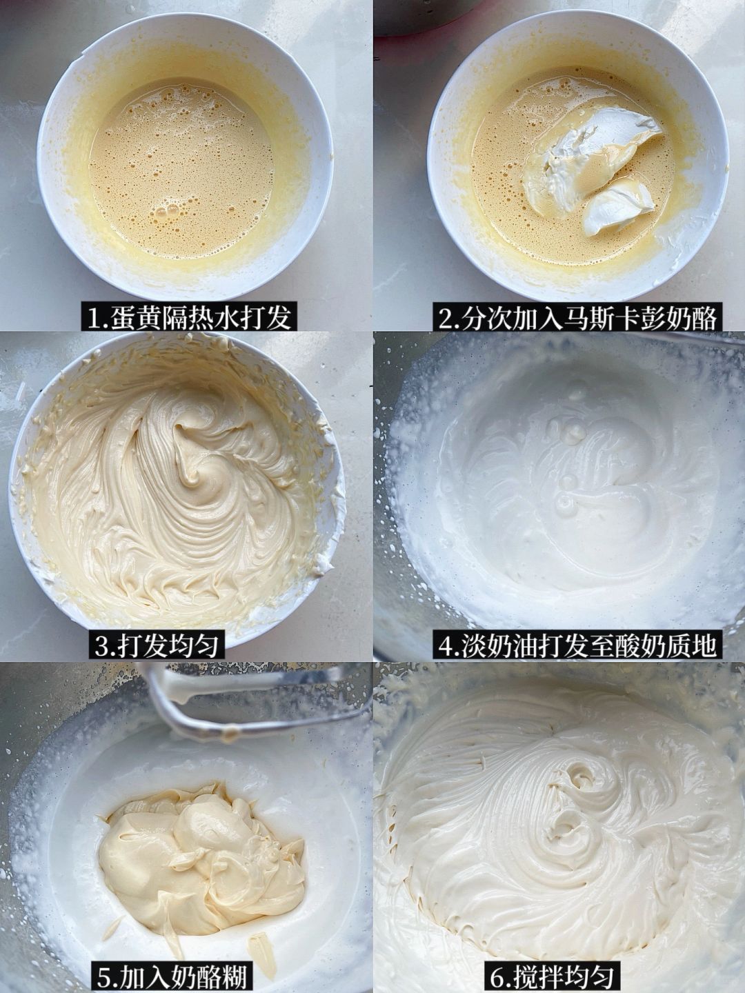 奶酪糊:无菌蛋黄3个 细砂糖 30g➕20g 马斯卡彭 250g 淡奶油200g