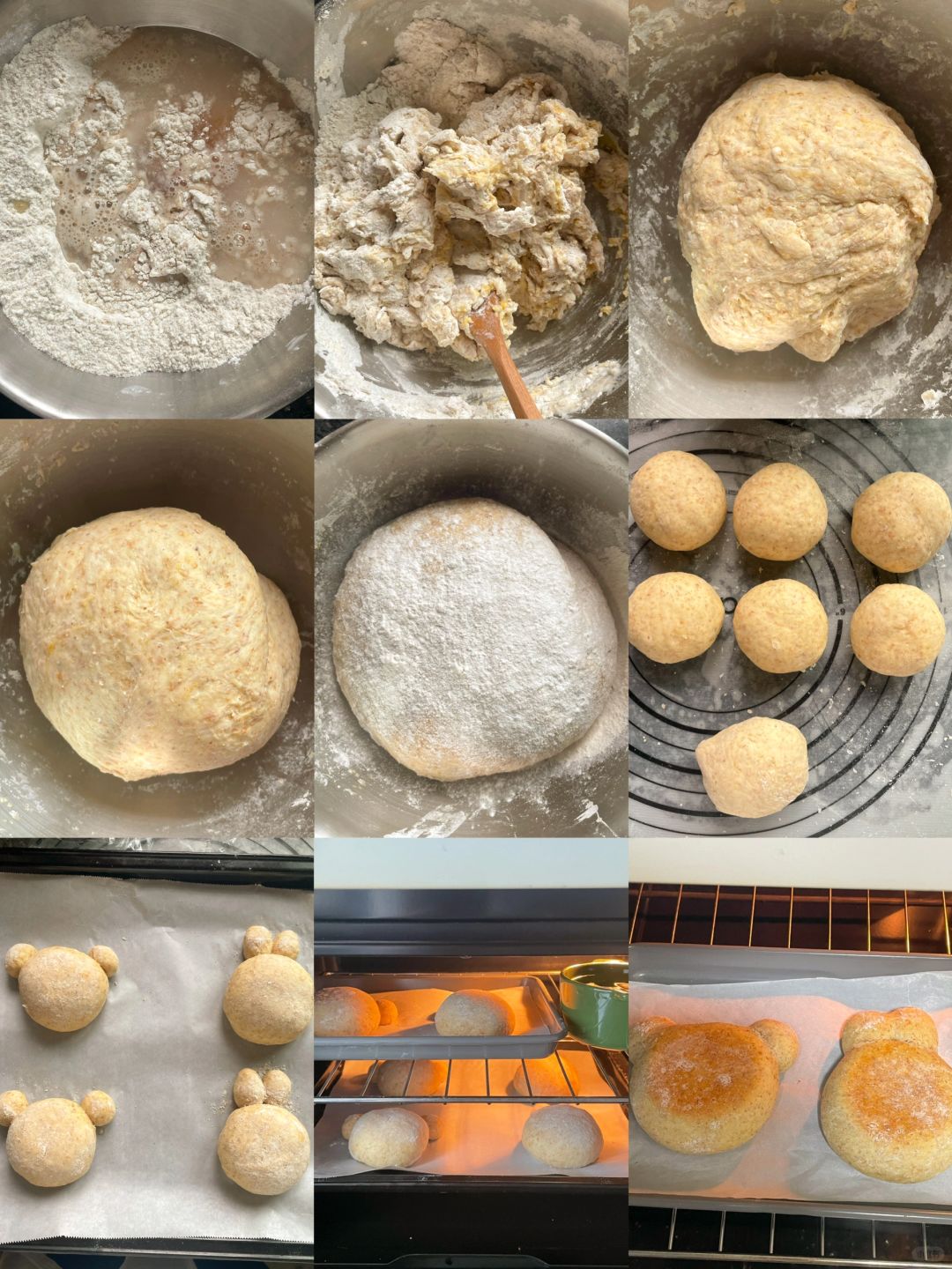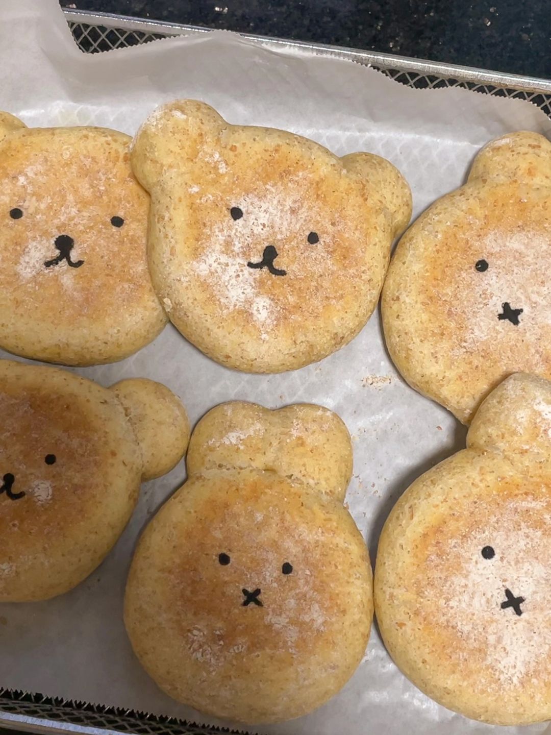 今天是全麦0⃣️油0⃣️糖的米菲兔麦芬 不需要揉面新手都可以完成✅ 比起上次的小猫麦芬 米菲兔麦芬会简单易上手些 - 材料:全麦面粉100g、高筋面粉150g、酵母2.5g、盐3g、鸡蛋1个、清水120g - 步骤: 1️⃣以上材料混合后揉成无干粉的面团,盖上保鲜膜放入冰箱冷藏水合30分钟 2️⃣水合完成后将面团稍微揉一揉,面团就光滑了 3️⃣进行一次发酵,室温发酵至两倍大 4️⃣发酵好的面团按压排气,分成均匀的6份团圆,提前留一些面团来做耳朵 6️⃣面团造型好后摆上烤盘进行二次发酵,30度40分钟,发酵至两bei大 8️⃣发酵好的面团,轻微拍扁,铺上油纸,上面压一个烤盘,放入预热好的烤箱180度烘烤20分钟 9️⃣烤好的面包放凉后画上表情就可以啦