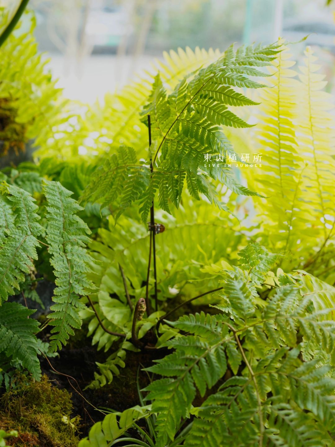 🟢因为装置在落地玻璃前,向阳位置的肾蕨会更黄一点。不同位置的苔藓状态有差异,整体上右侧的苔藓状态更好,可能是浇水和光线的差异导致。