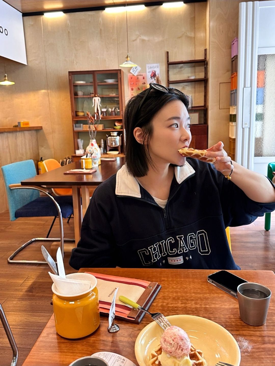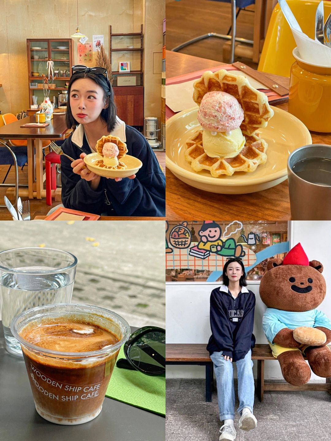 ✌🏻去吃了心心念念很久的幸福铁板烧 把饭一起炒进去好吃! TJ加花菜,油麦菜,包菜,洋葱,牛肉 吃完溜达去無早和WOODEN SHIP Cafe☕️ 米浆脏咖啡好喝亖!不过他家没有好吃的甜品 直接去Assembo点了份山楂奶油冰淇淋华夫🧇