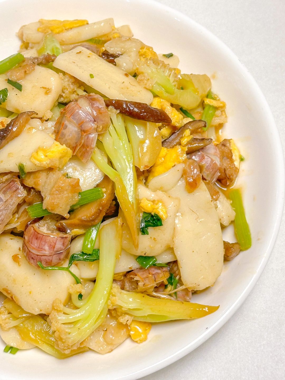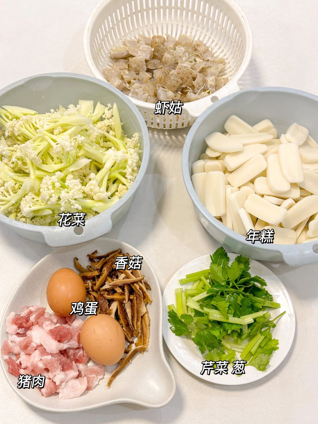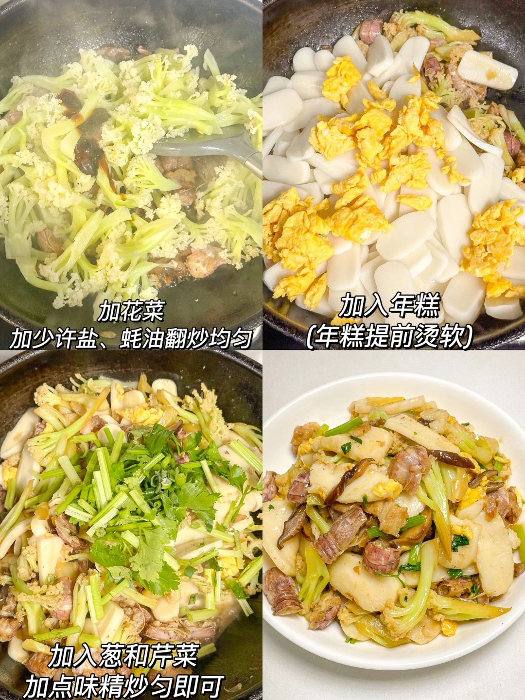 温州人冬天必吃的虾姑炒年糕🍽️!虾姑的鲜美配上花菜年糕也是一绝!!做法简单无失败!!赶快学起来叭☺️☺️☺️ ㅤ 🌟准备食材🌟 鸡蛋 虾姑 年糕 花菜 干香菇 猪肉 芹菜 葱 🌟做法🌟 1️⃣蛋打散炒成蛋花备用,花菜先烫一下,年糕也用开水烫一下会软一点,干香菇泡软切片 2️⃣锅中加肉炒香,放虾姑炒熟,放香菇加红糖、料酒翻炒均匀 3️⃣加花菜,加少许盐、蚝油翻炒均匀 4️⃣炒好了再放年糕,鸡蛋翻炒均匀,再加入葱和芹菜,加点味精炒匀即可